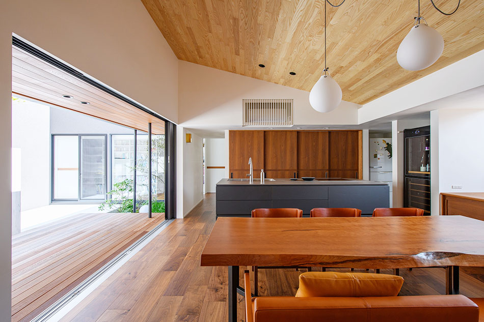 素足に触れる無垢材の床は夏涼しく冬暖かく、ドアを開けるたびにふわりと木の香りが心を和ませる。