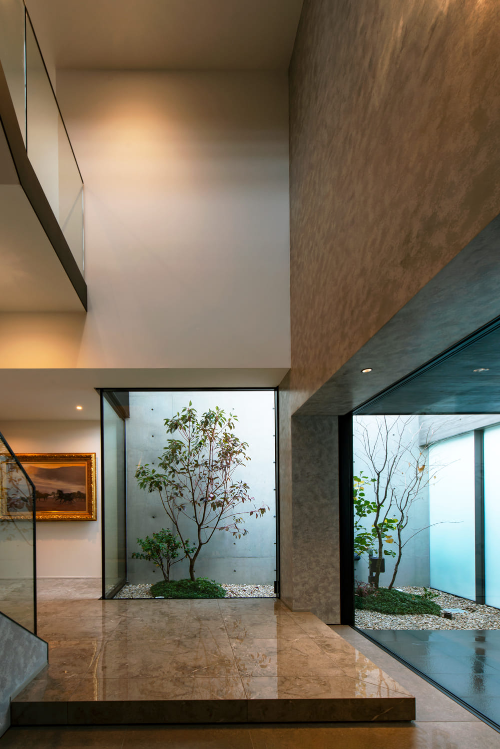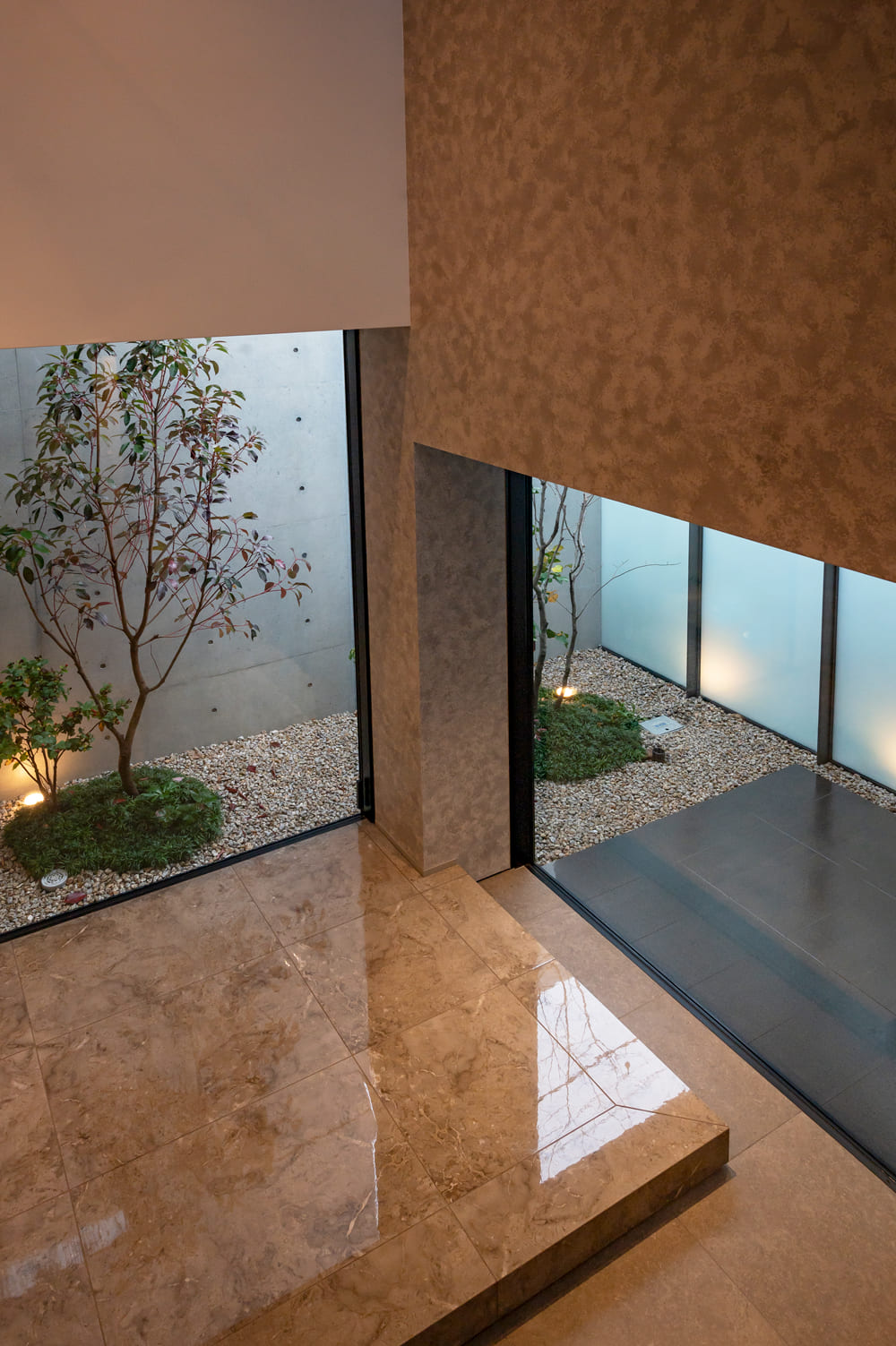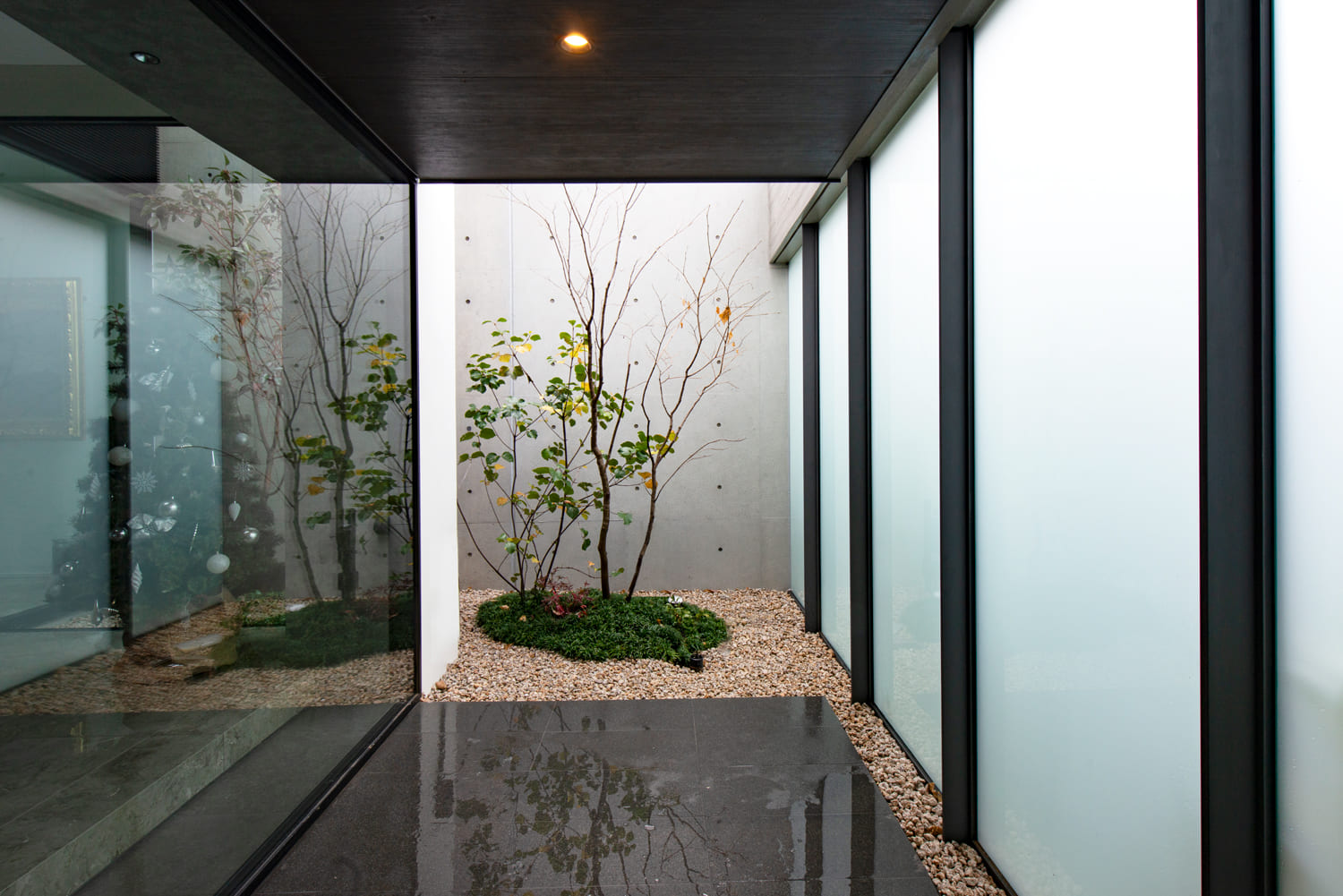 ガラス張りの壁の向こうには、この家のためだけにしつらえられた、美しい植栽が息づく中庭が。