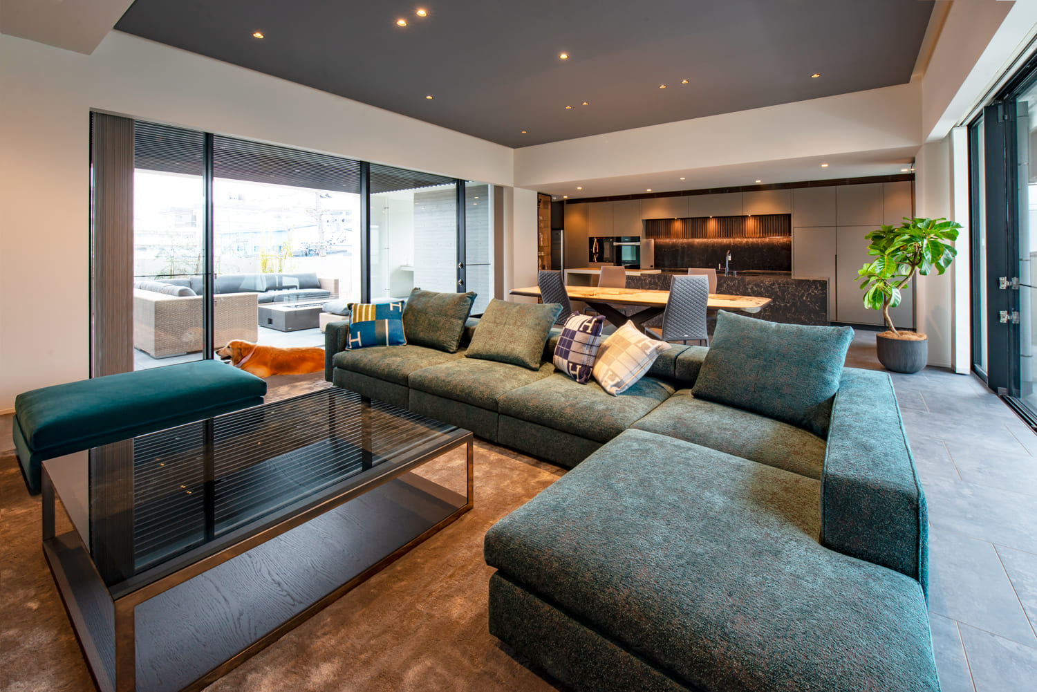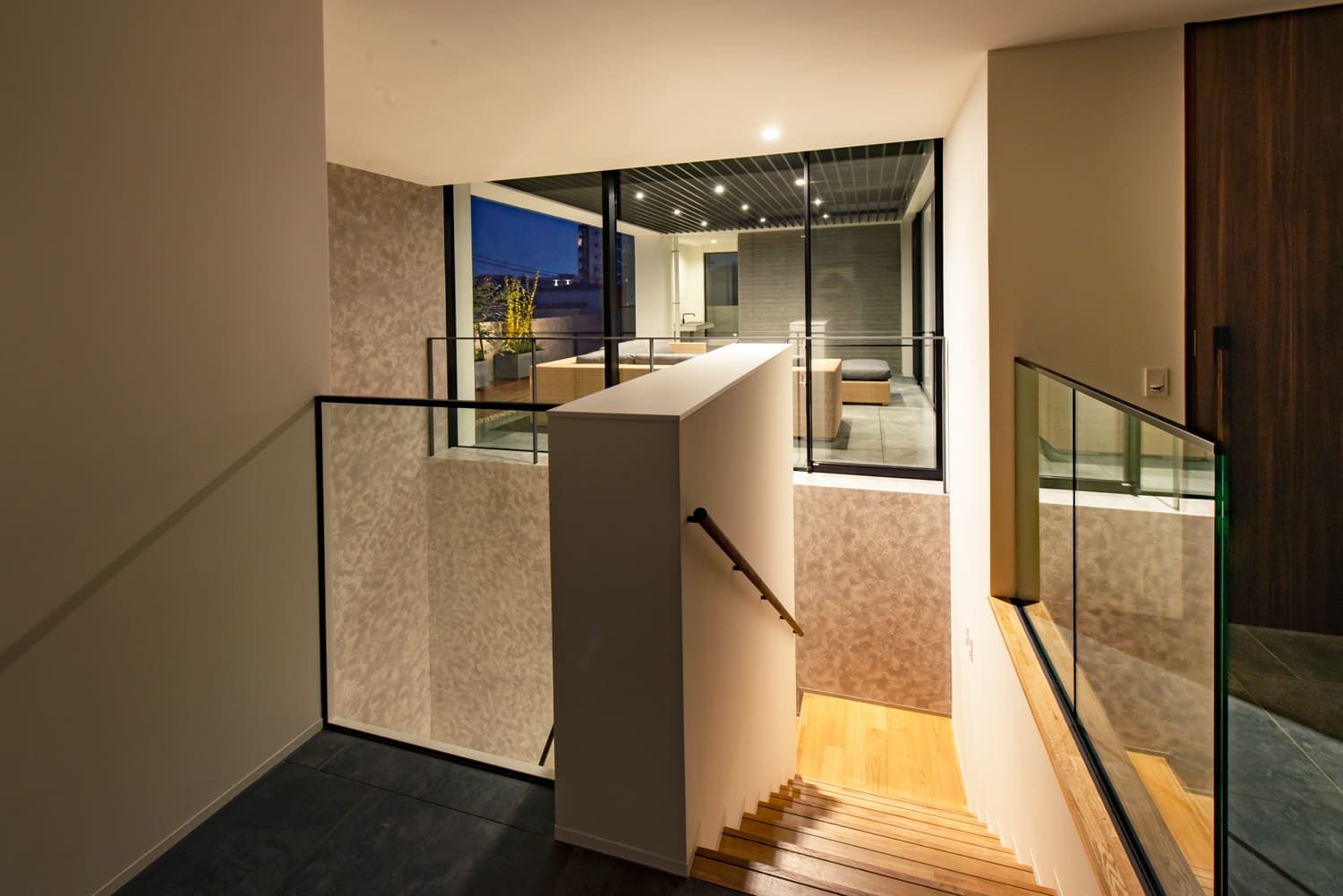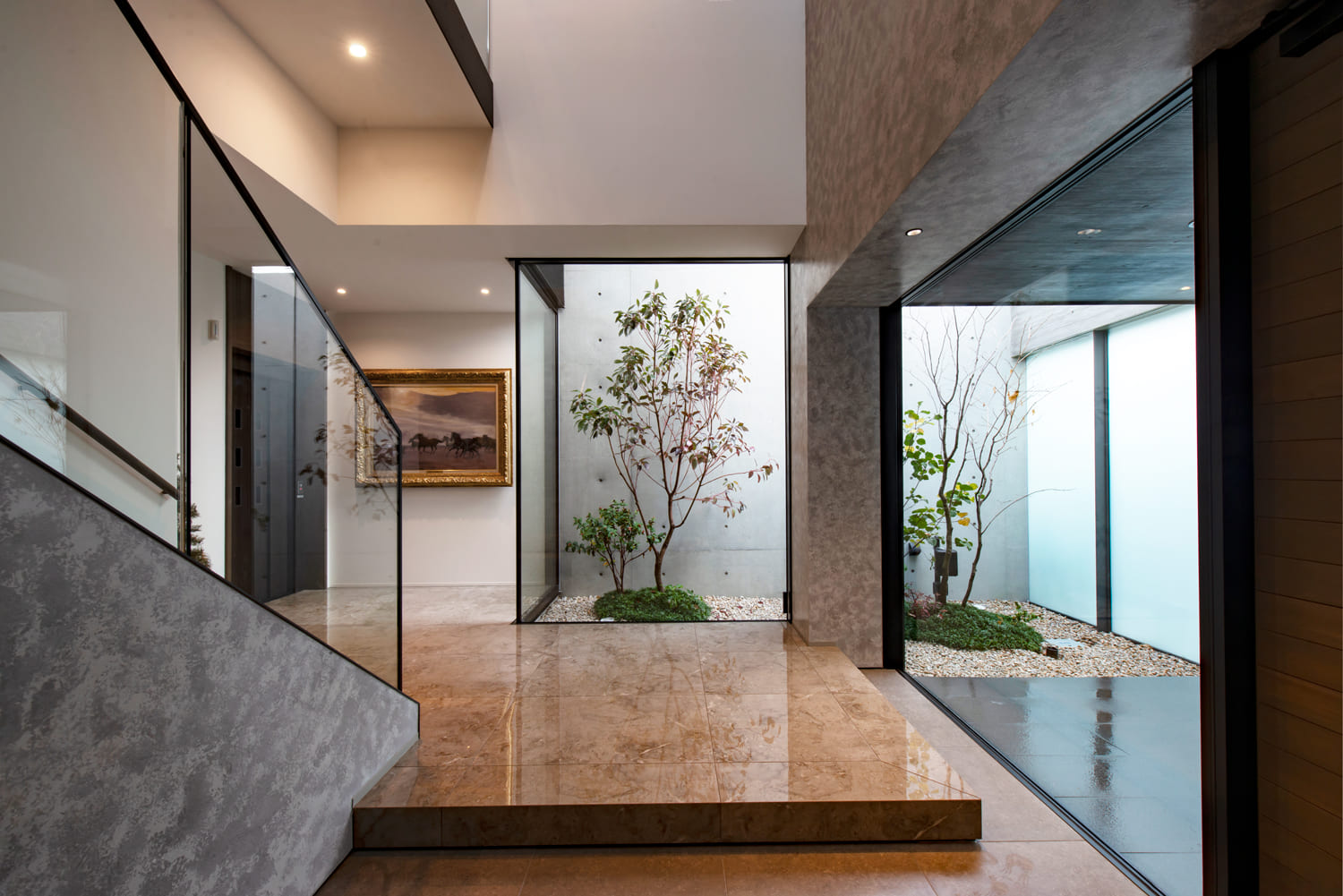 ガラス張りの壁の向こうには、この家のためだけにしつらえられた、美しい植栽が息づく中庭が。