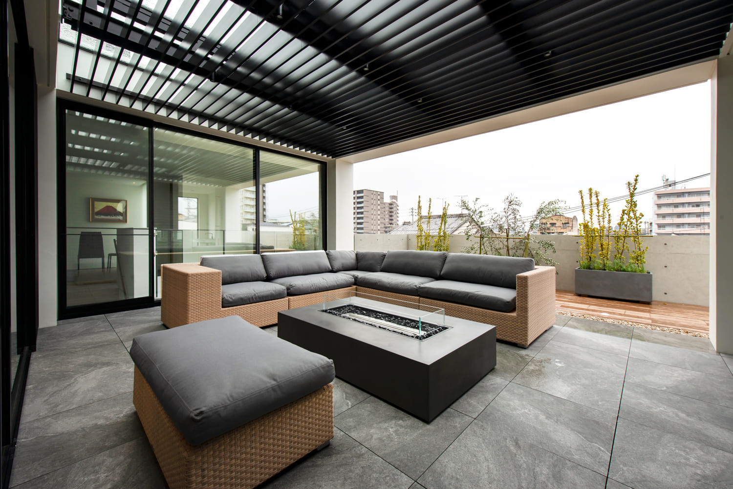 空と、街の光と、揺らめく炎を独り占めにする、まさに「天空のリビング」です。