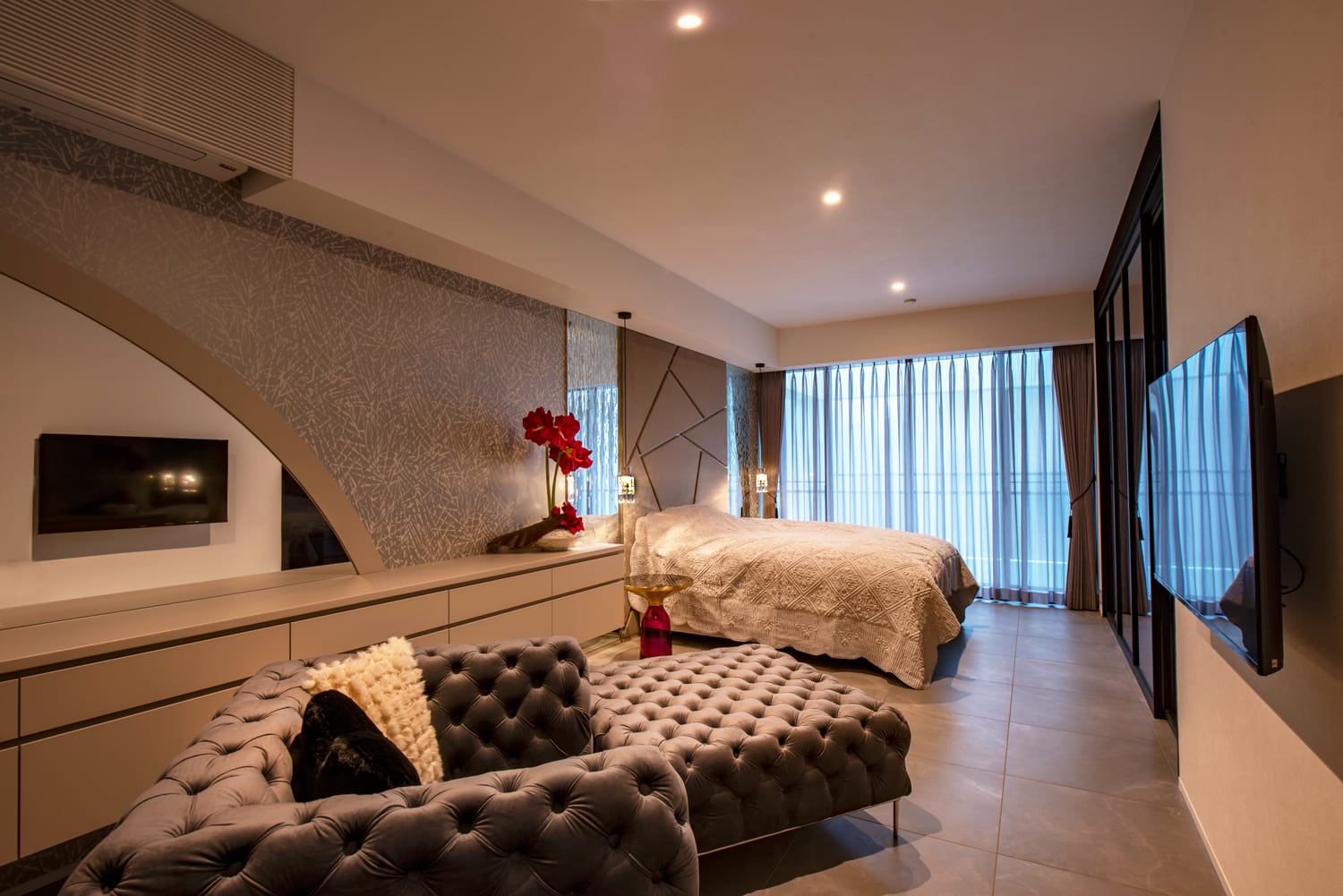 【ベッドルーム】上質な闇と光が、眠りを誘う。一日の終わりを包み込む、静寂の寝室