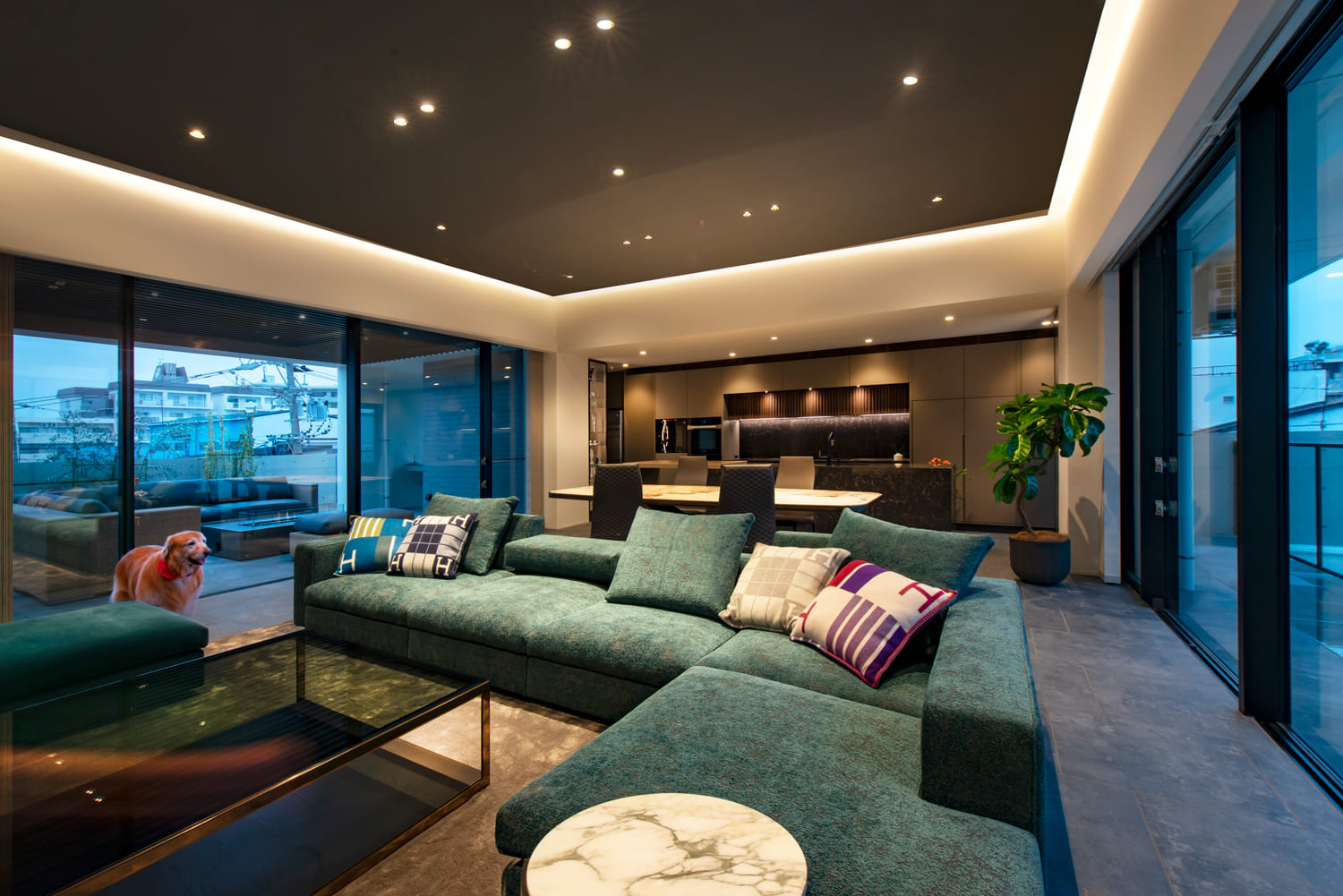 【リビング・ダイニング】夜景という名の、巨大なアート。石と光が織りなす、至高のくつろぎ空間