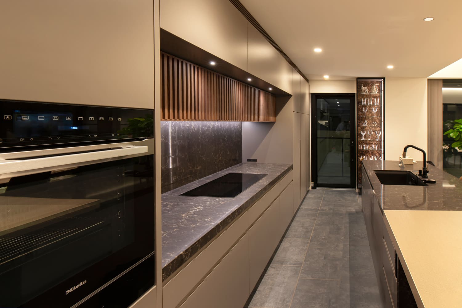 壁にあしらわれた重厚な石の素材感と、天井に巡らせた柔らかな間接照明が共鳴し、まるで高級ホテルの最上階スイートのような、圧倒的な非日常感と、深い安らぎを同時に実現しています。