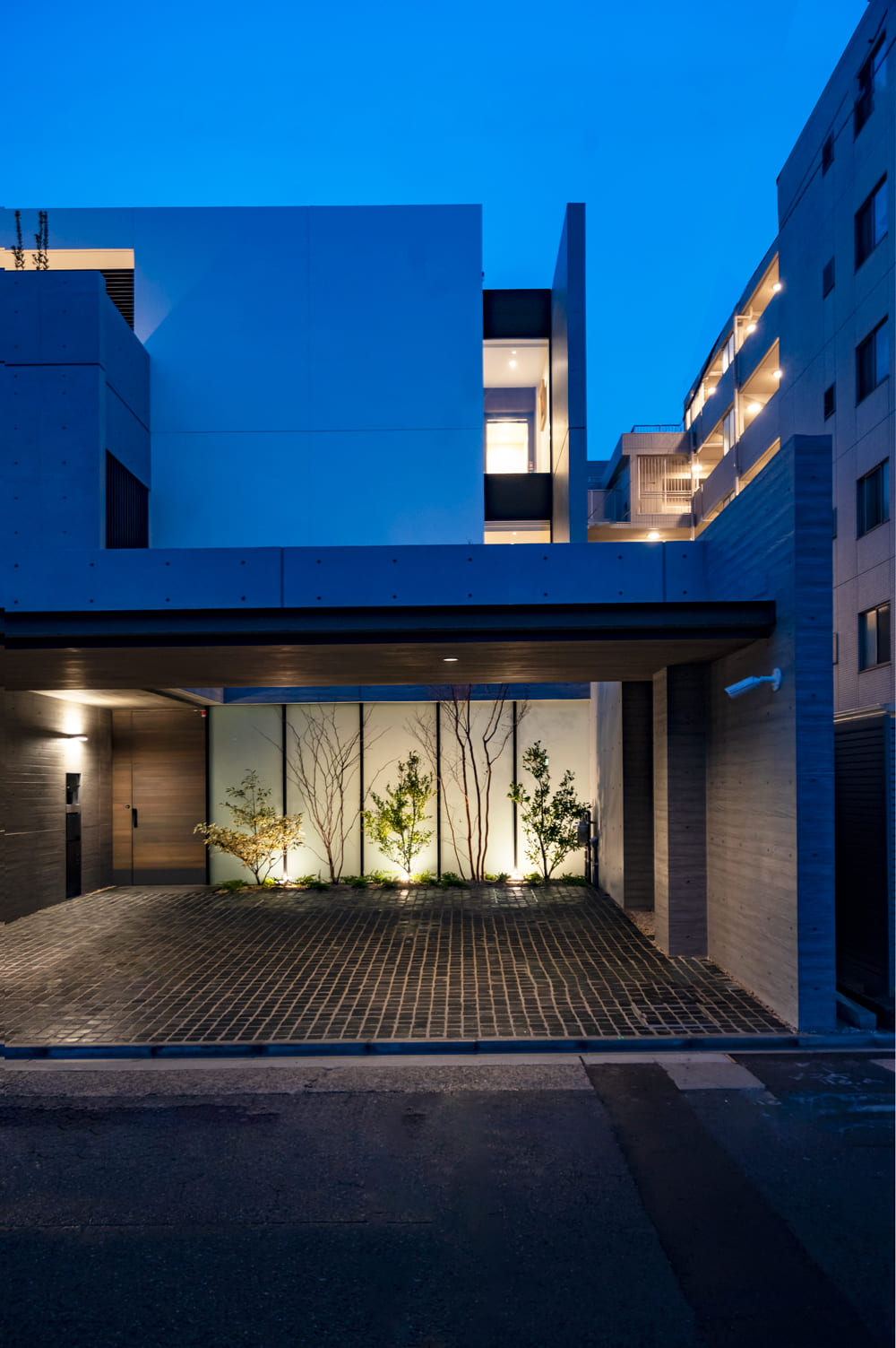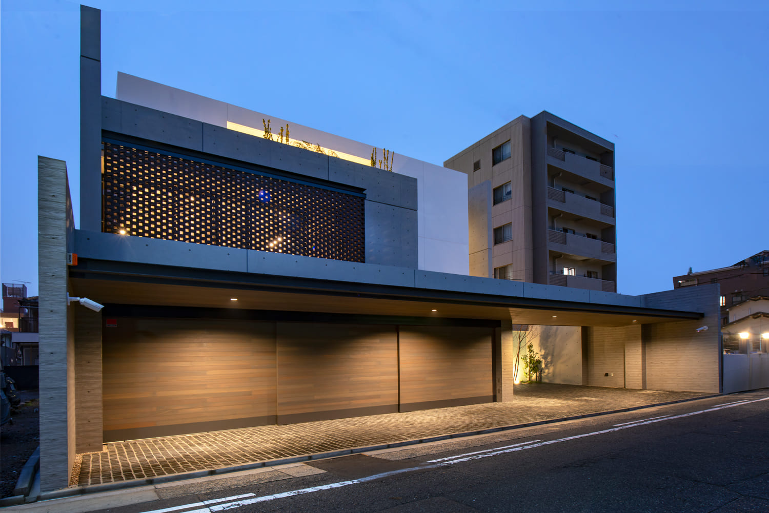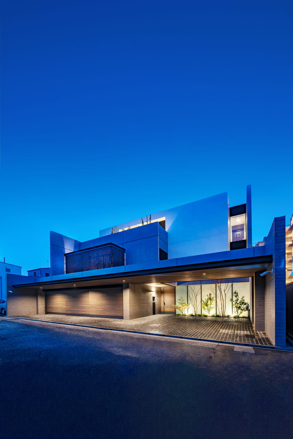 無機質に見えがちな素材も、リズミカルな配置と夜の美しいライティングによって、まるで現代アートの彫刻のような、威厳と品格のある「邸宅の顔」となります。