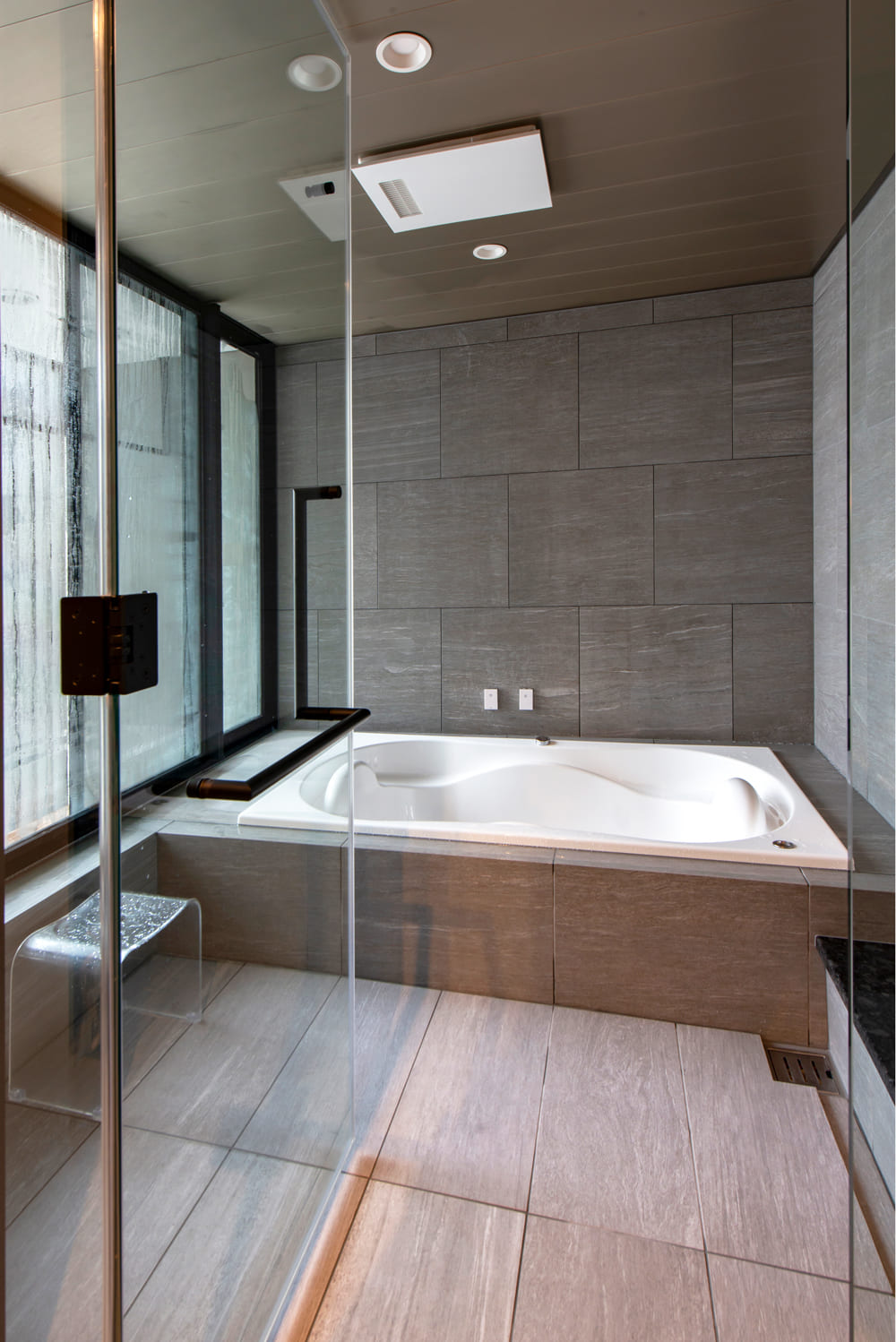 ガラス張りの壁が、空間に驚くほどの広がりと開放感をもたらし、まるで高級スパのよう。