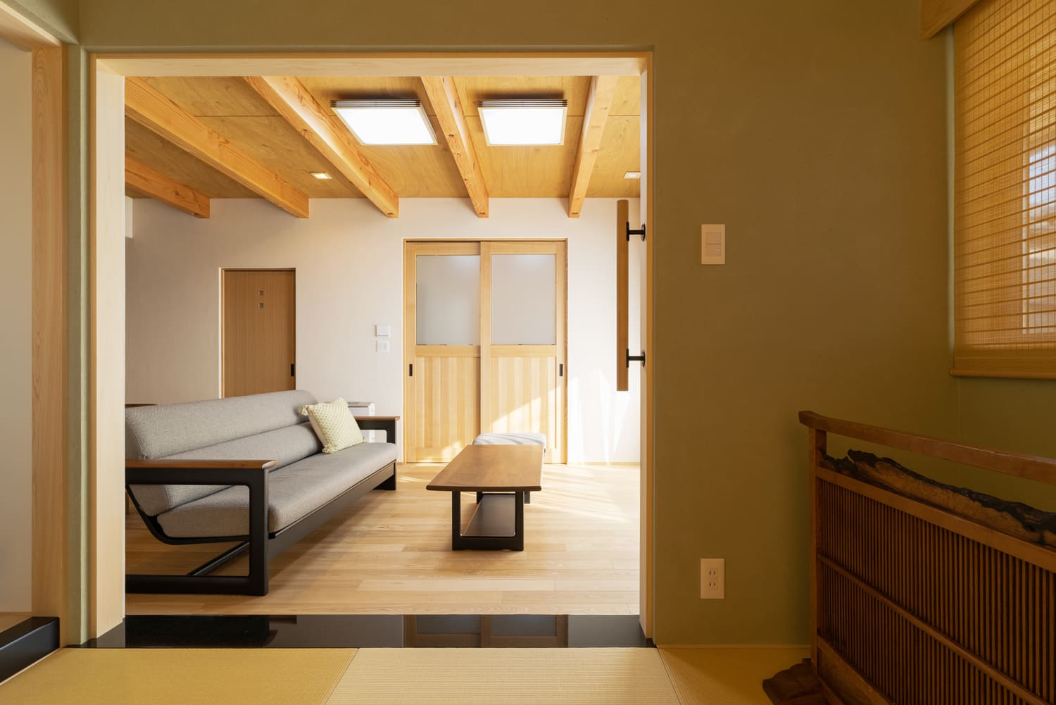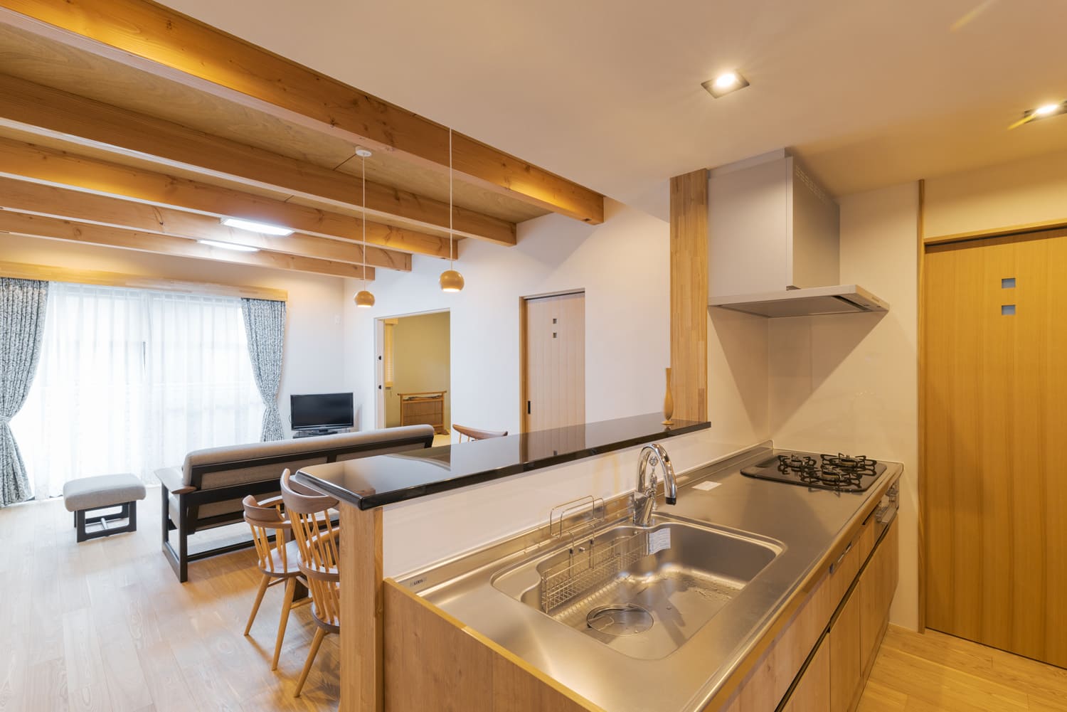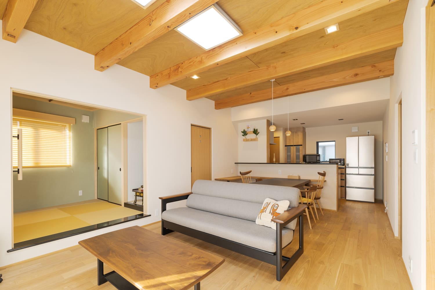 この邸宅の主役は、リビングの天井を堂々と貫く、立派な木の「現し梁」。