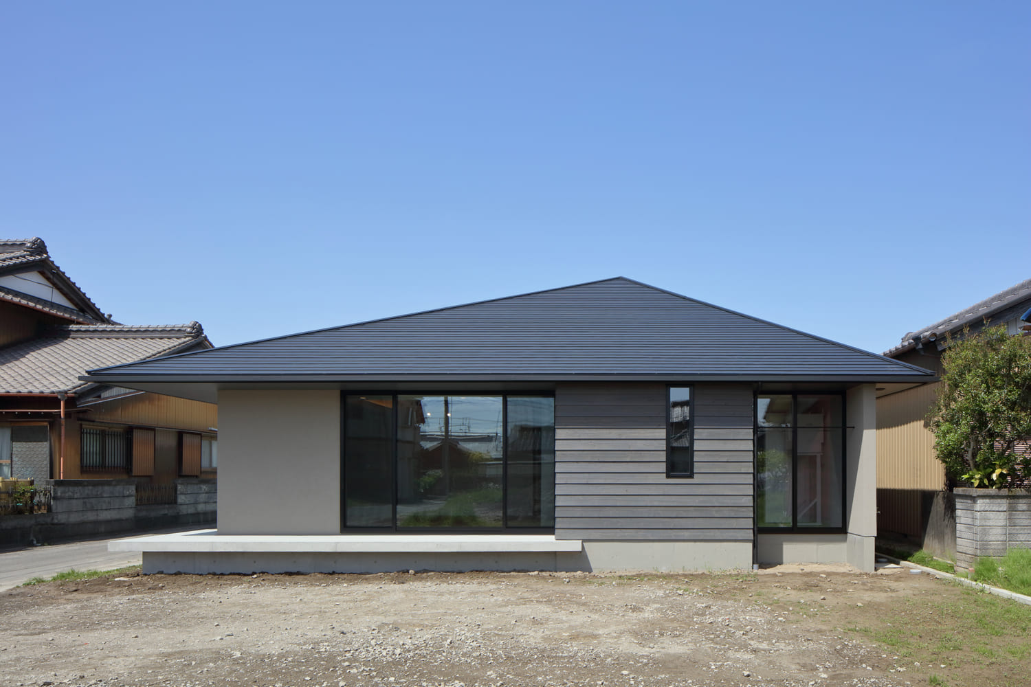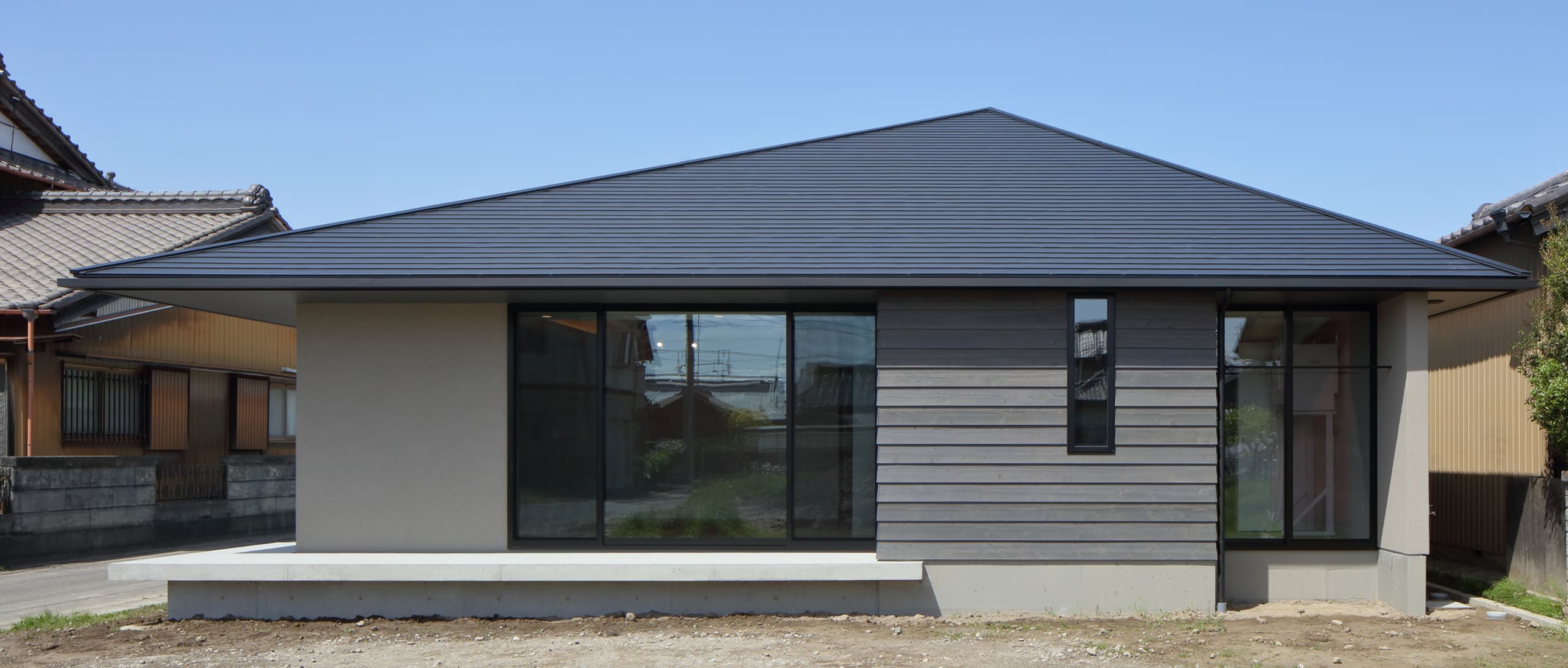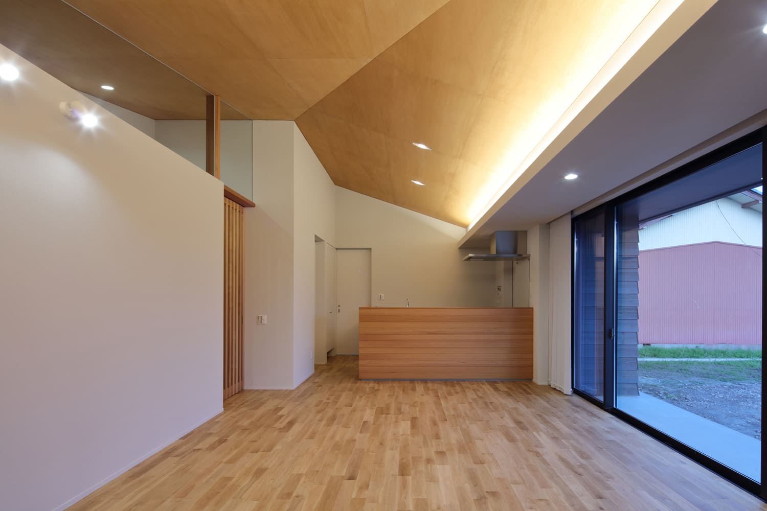 一見すると、大地に根差したような、穏やかで落ち着いた佇まいの平屋。しかし、その扉を開けると、まるで建築家が折り紙を折ったかのような、ダイナミックで美しい木の天井が広がる、驚きの空間が待っています。