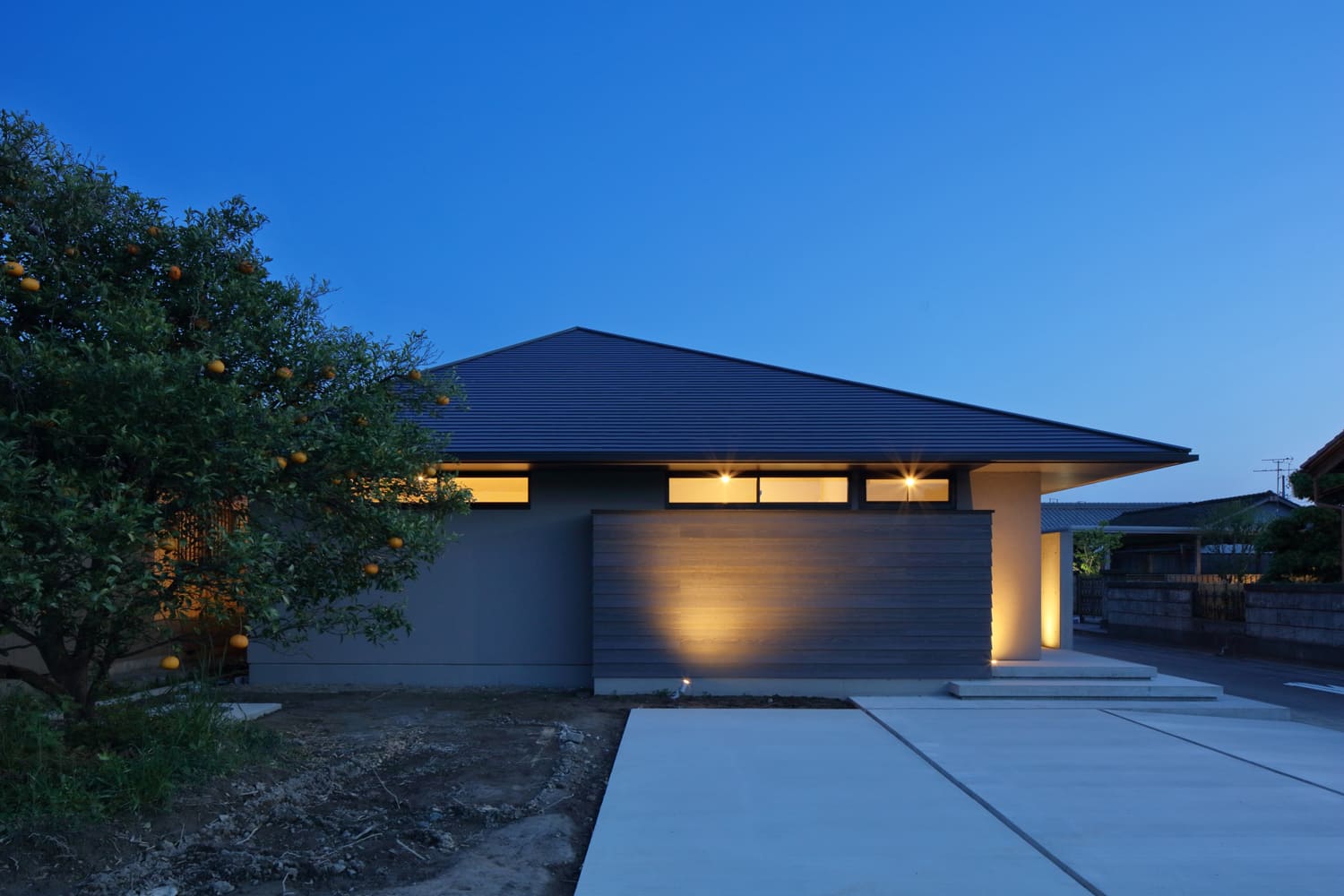 【外観】大地に根ざす、落ち着いた佇まい。光と素材が織りなす、静謐な夜の表情。