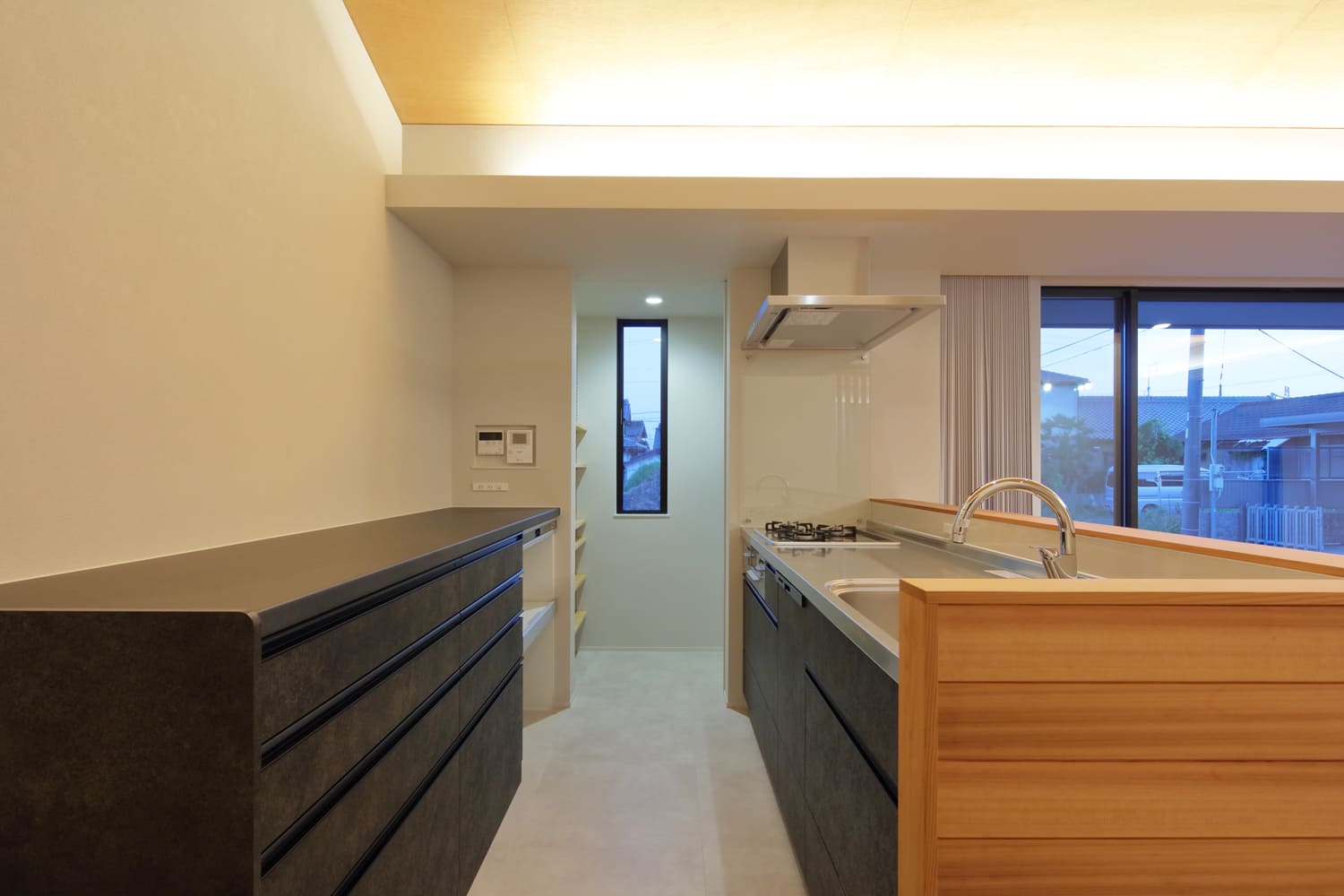 この家の主役は、リビングからダイニング、キッチンまでを覆う、幾何学的に折られたような美しい木の天井です。複雑な天井の面が、間接照明の柔らかな光を様々な角度で反射し、時間や季節によって室内の表情を豊かに変化させます。見上げるたびに、その造形美に心が躍る。家族が多くの時間を過ごすリビングを、アートのような空間へと昇華させています。