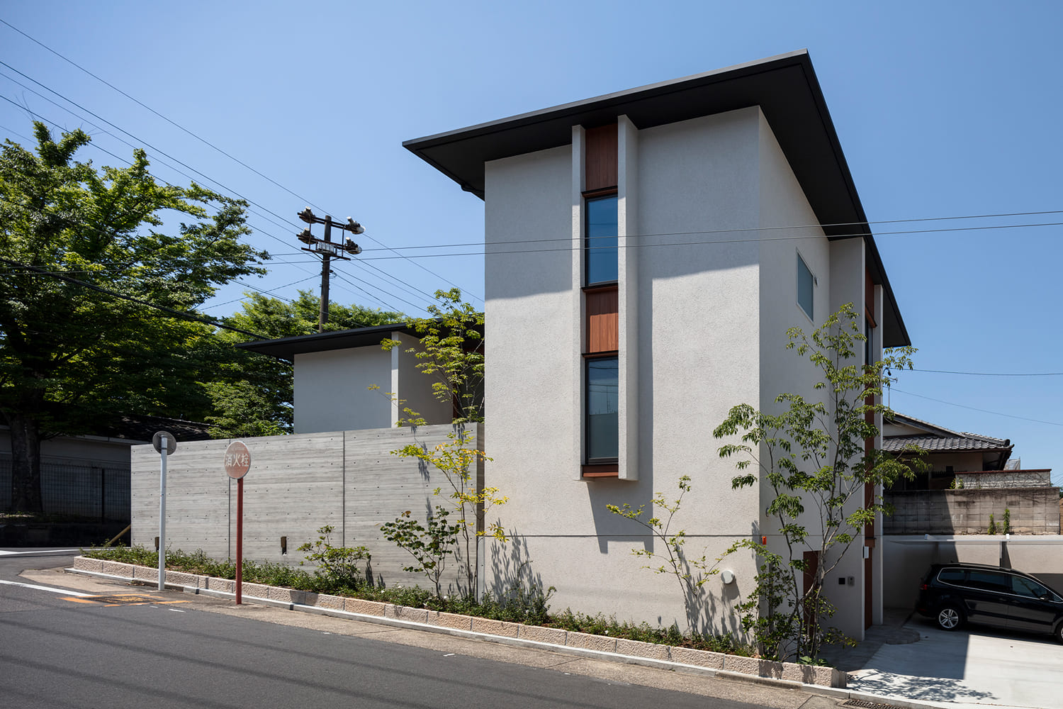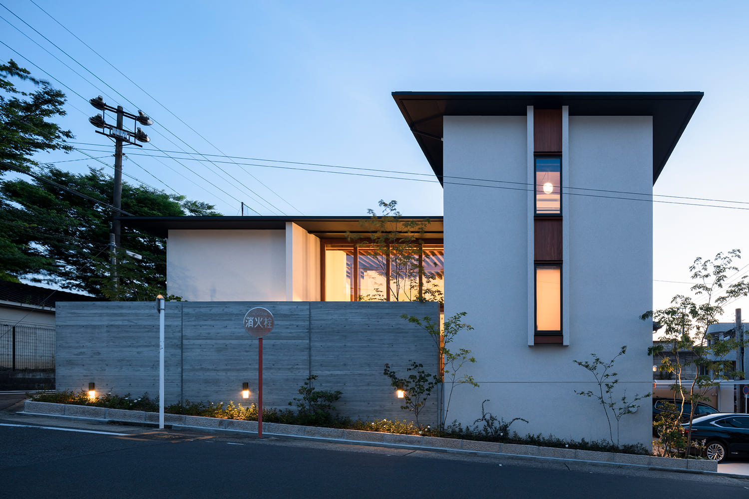 【外観】街の喧騒から家族を守る、静謐な佇まい。光が彩る、彫刻のような造形美。