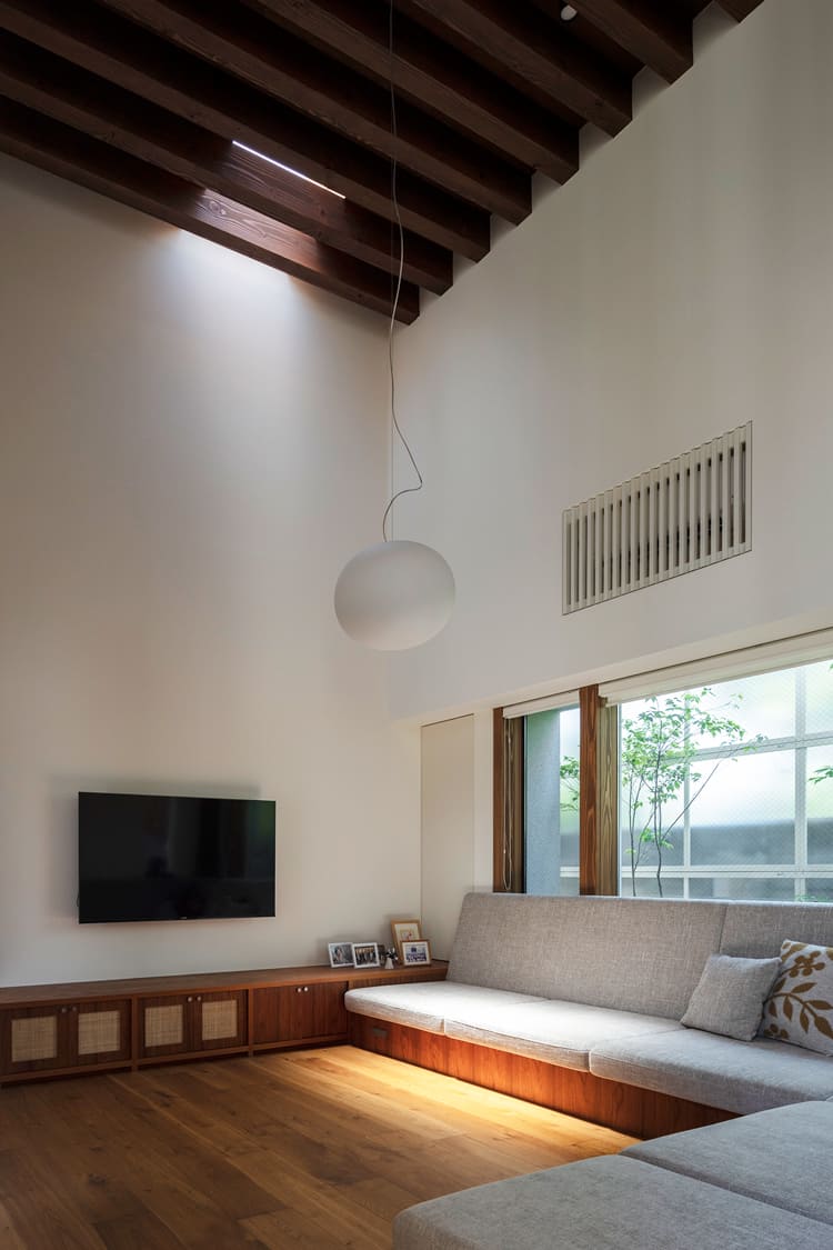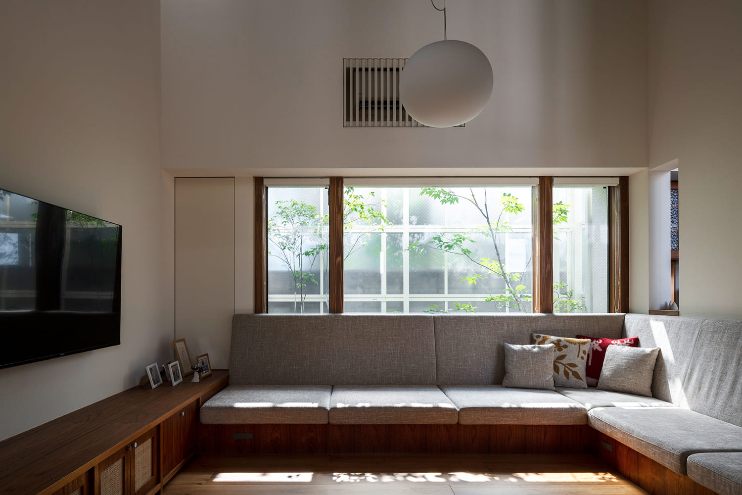 ダイニングから一段上がったリビングは、大きな窓に沿って造り付けられたL字ソファが主役。