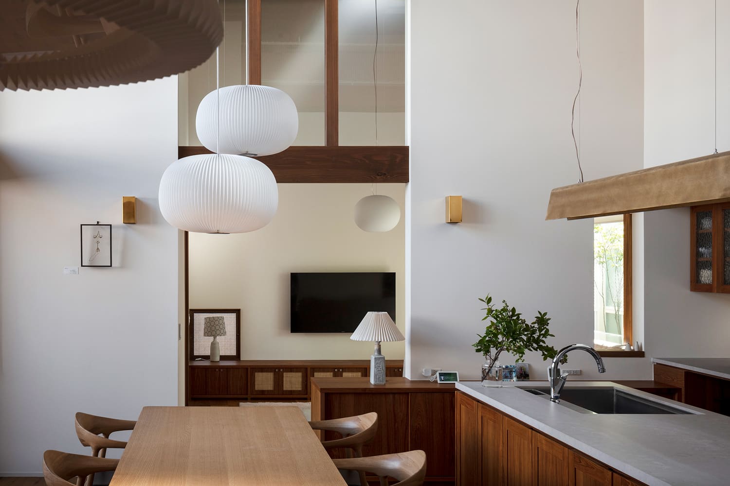 柔らかな光に満ちたこの場所は、自然と家族が集まる、家の心臓部です。