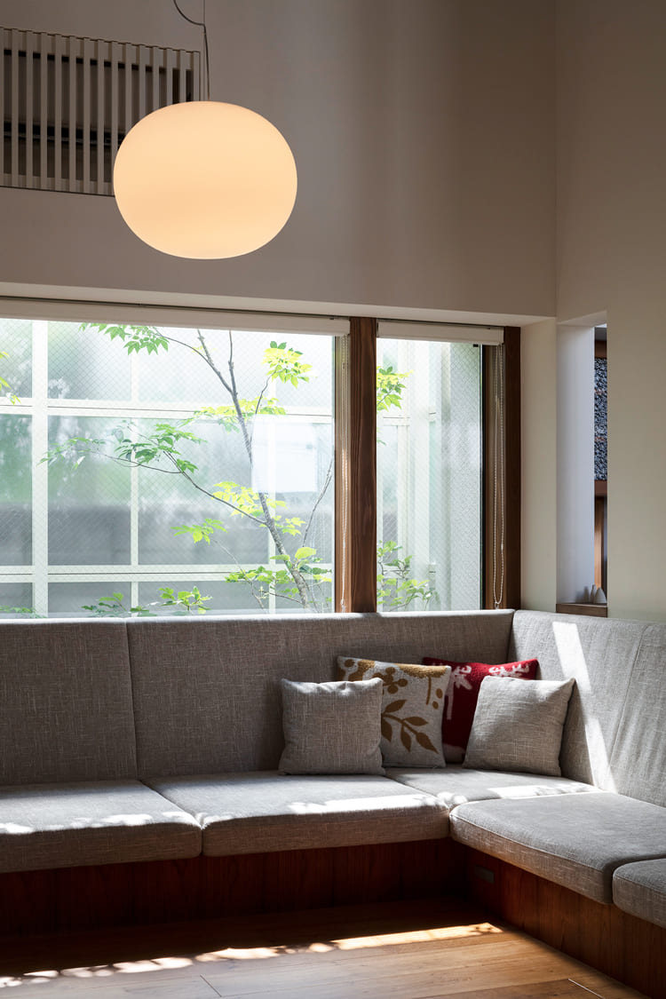 【リビング】窓辺の造作ソファは、家族の特等席。光だまりの中で、ゆったりと時を過ごす。
