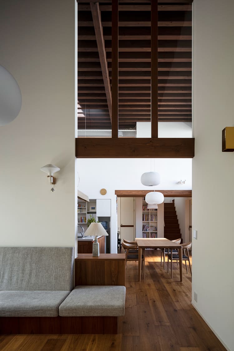 リビングとダイニング、それぞれの空間が緩やかに繋がりながら、心地よい「おこもり感」も生み出しています。