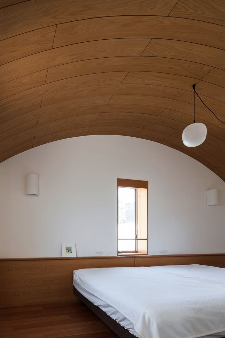 寝室は、リビングのダイナミックな空間とは対照的に、美しいアーチを描く「かまぼこ天井」が、優しくこぢんまりとした印象を与えます。