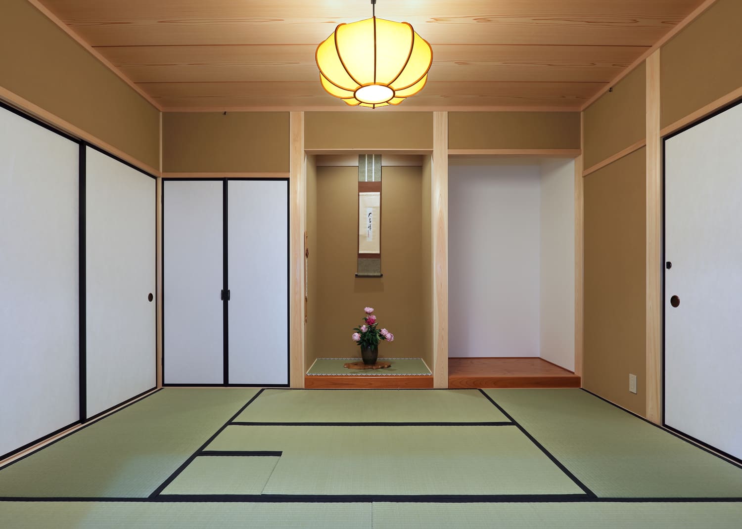 床の間、違い棚を備えた本格的な和室。い草の香りが清々しい畳の上で過ごす時間は、心を穏やかに整えてくれます。お客様を丁寧におもてなしする客間として、また、時には寝転がってくつろぐ家族の憩いの場として、暮らしに深い趣と安らぎを与えてくれます。掛け軸や生け花が映える凛とした空間は、日本の美しい伝統を大切にする、この家の象徴です。