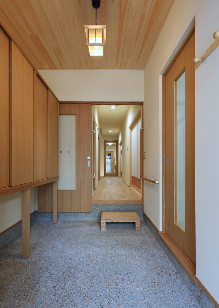 玄関の扉を開けると、美しい木目の天井と趣のある土間が迎えてくれます。奥へと続く廊下は、これから始まる「我が家の物語」への期待感を高めるアプローチ。壁に設けられた手すりは、デザインのアクセントになるだけでなく、ご家族が将来にわたって安心して暮らせるための優しい配慮です。
