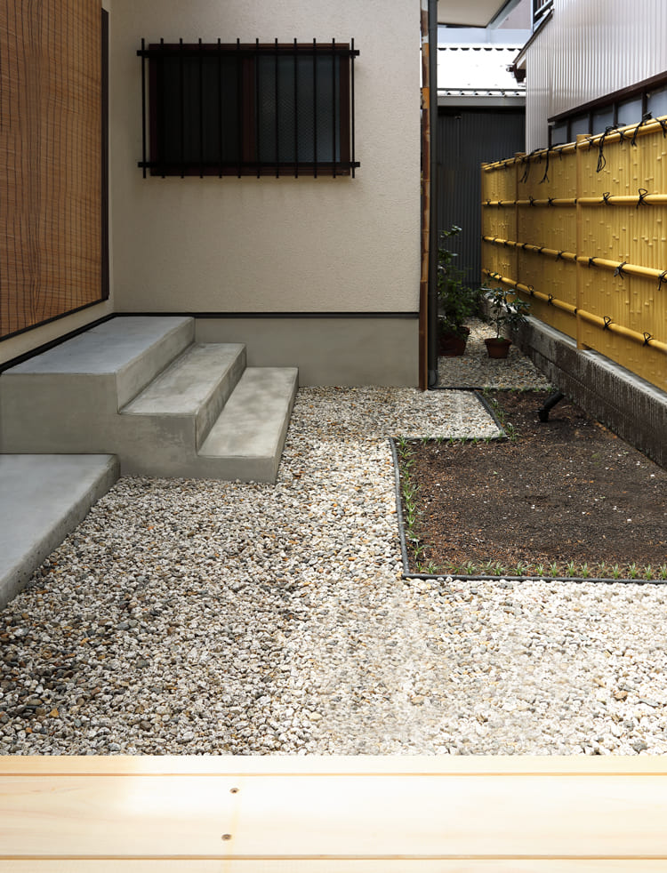 この住まいの魅力は、道路から玄関へと続く、美しい「路地」にあります。洗い出し仕上げの床と、清々しい竹垣が、訪れる人を日常から非日常へと誘う、静かなアプローチ。この趣のある空間が、治療院としての品格を高め、暮らしに豊かな潤いをもたらしてくれます。