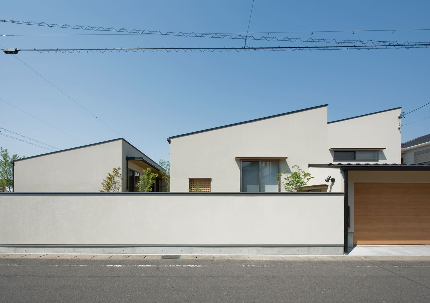 リズミカルに連なる、シャープな片流れ屋根。そして、外からの視線を遮り、家族のプライバシーを確保する、シンプルで美しい壁。閉じるべきところは閉じながら、木で仕上げた温かみのある玄関が、訪れる人を優しく招き入れ、その先に広がる心地よい空間への期待感を高めてくれます。