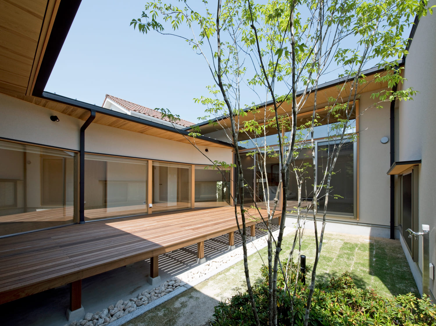 この住まいの心臓部とも言えるのが、「コ」の字型の建物に囲まれた、広々としたウッドデッキです。リビングからも、隣の和室からも、段差なくスムーズに出入りが可能。天気の良い日には、庭で遊ぶ子どもを見守りながら、デッキでゆっくりお茶を飲む。そんな、内と外が一体となった、豊かな暮らしの中心となる空間です。