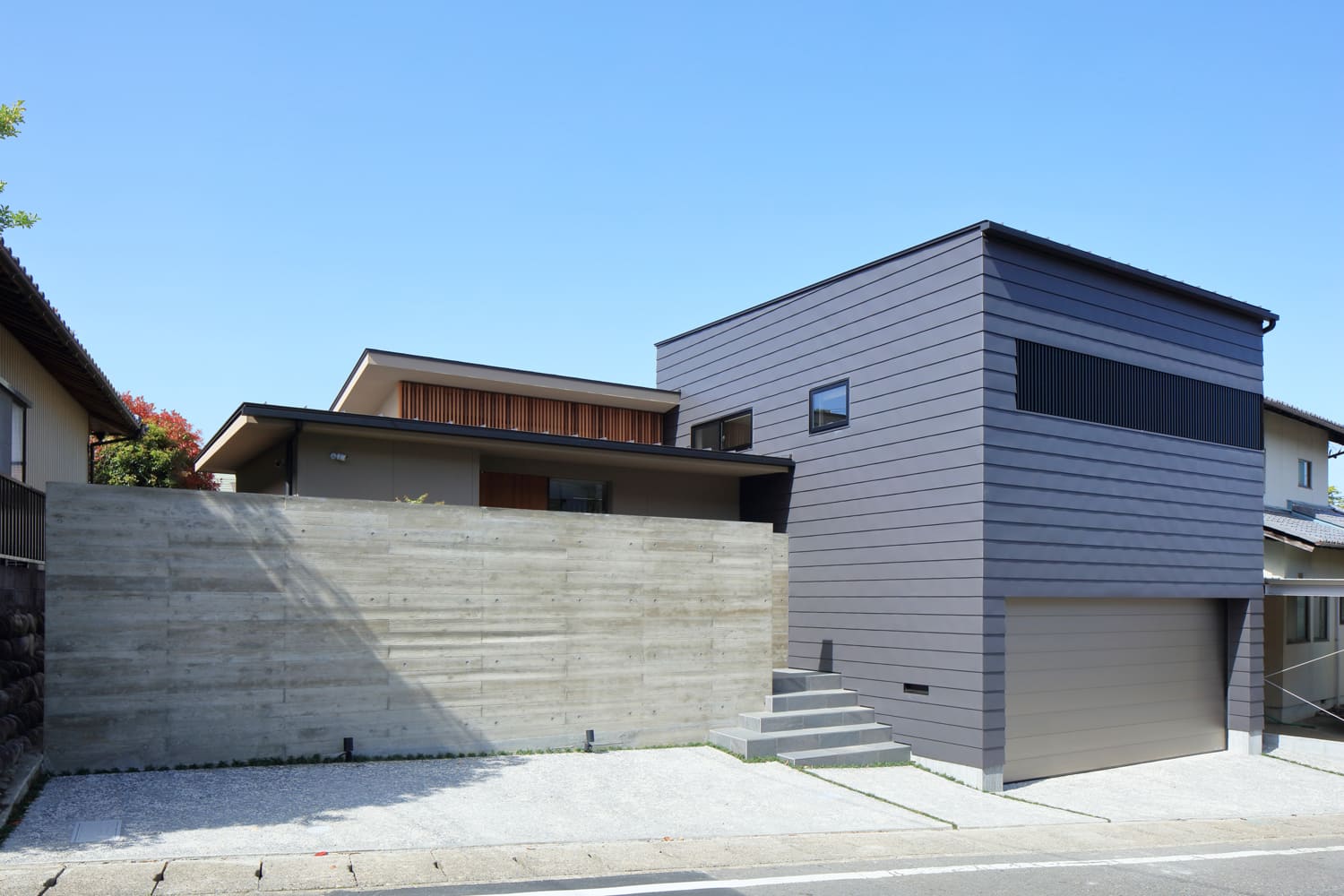 【外観】閉じて守り、内に開く。二つの建物が織りなす、静かなる邸宅。