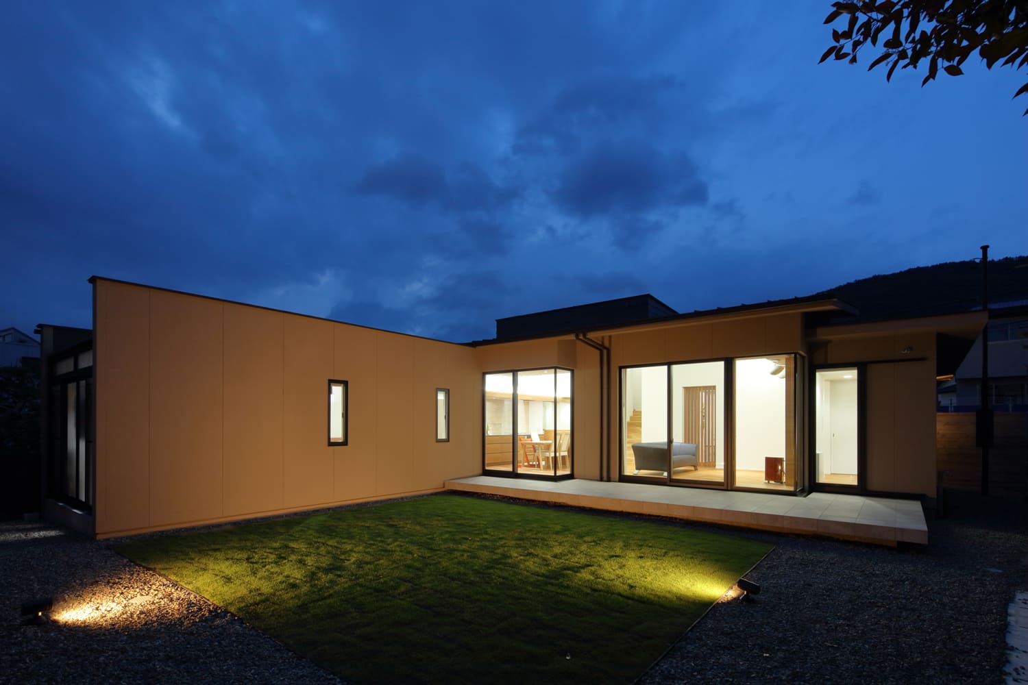 プライバシーを守るコンクリートの壁と、ガレージのある二階建ての棟、そして庭を囲む平屋の棟。異なるボリュームの建物を組み合わせることで、街並みにリズミカルで美しい表情を生み出します。夜には、計算された照明が壁や木々を優しく照らし出し、温かい室内の光がこぼれ、まるで高級ホテルのような、気品あふれる佇まいを演出します。