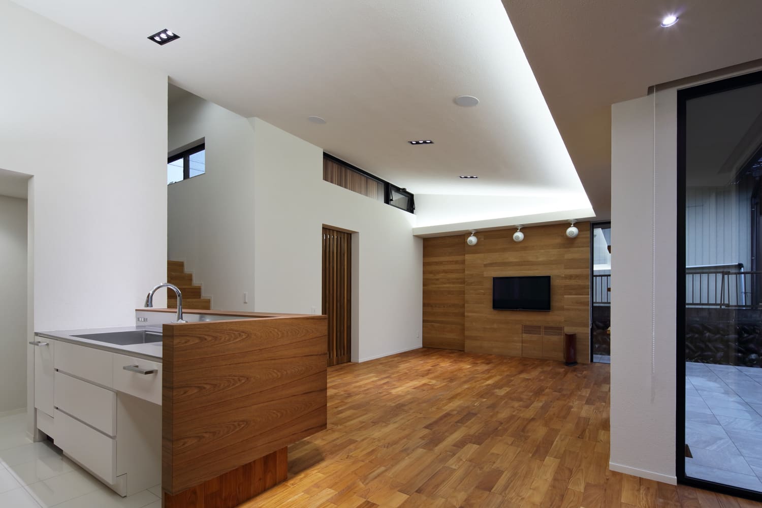 この家の主役は、壁一面の大きな窓の向こうに、プライベートな芝生の庭が広がる、開放感あふれるリビングです。窓を全開にすれば、リビングと庭がひと続きになり、内と外の境界線がなくなった広々とした空間が出現。天井に設けた間接照明が、空間全体を柔らかな光で包み込み、心からリラックスできる上質な時間を演出します。