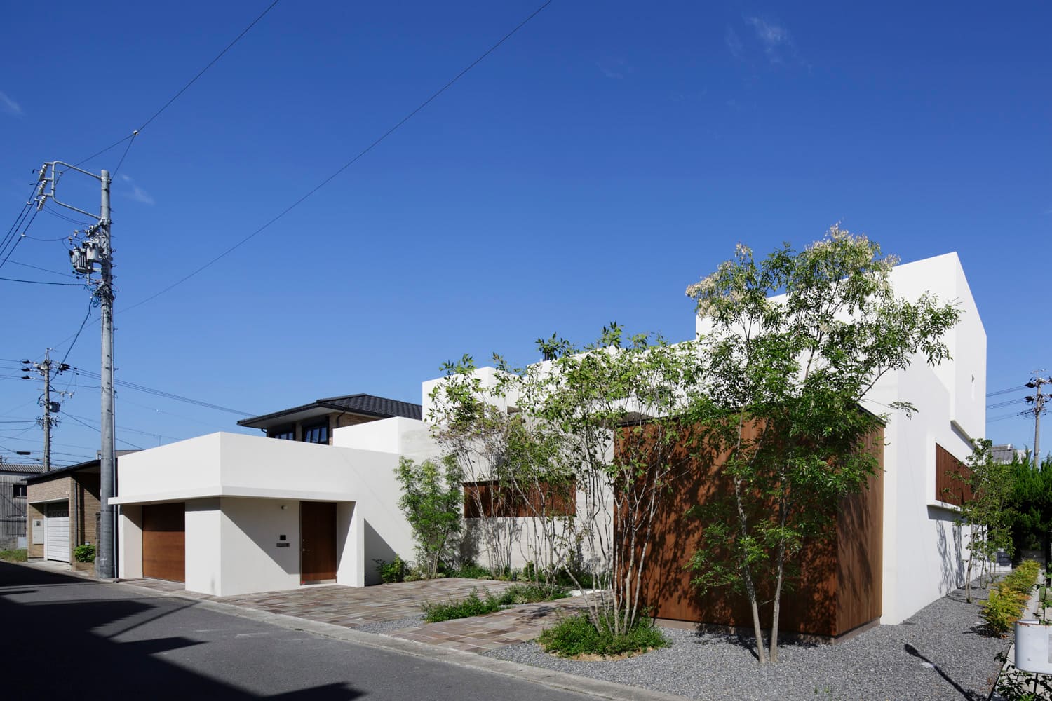 白い壁の箱、温かみのある木の箱、そして、それらの間を彩る、みずみずしい木々の緑。異なる素材や形の建物を、リズミカルに組み合わせることで、まるで「小さな街」のような、変化に富んだ楽しい外観をつくりだしました。建物と建物の間には、植栽の緑がのぞき、閉鎖的になることなく、街並みに豊かな表情を与えています。