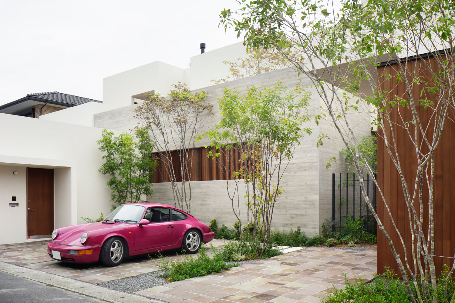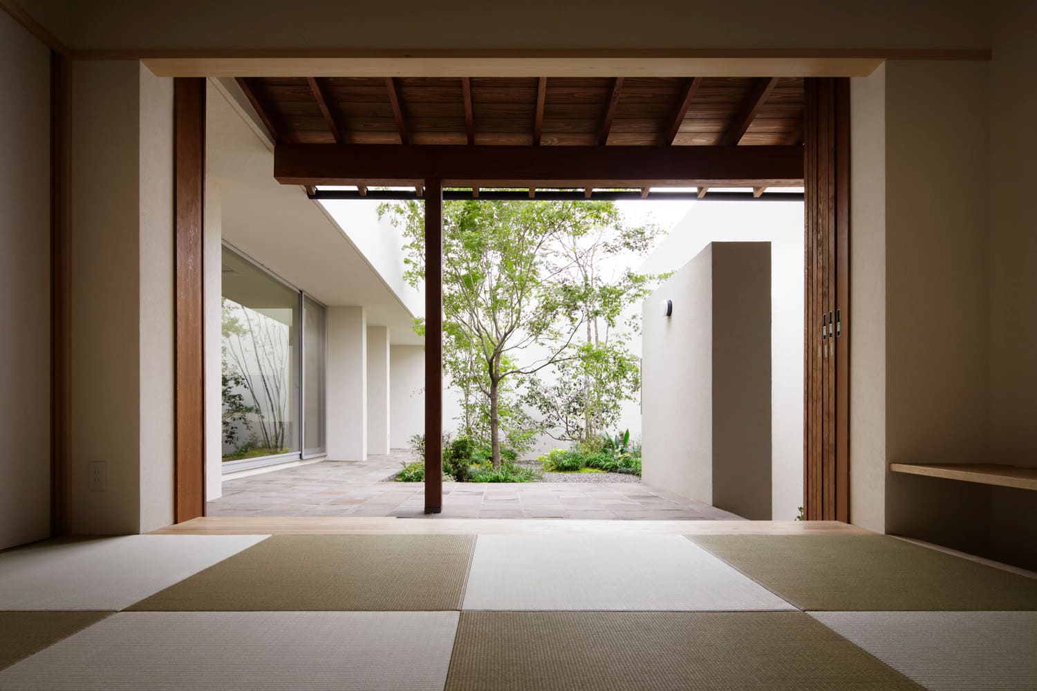 この住まいは、一つの大きな箱ではありません。リビングの棟、寝室の棟、そしてそれらを繋ぐ渡り廊下。まるで、自分たちのためだけの、小さな「村」のように、複数の建物を、緑豊かな中庭を囲んで配置しました。