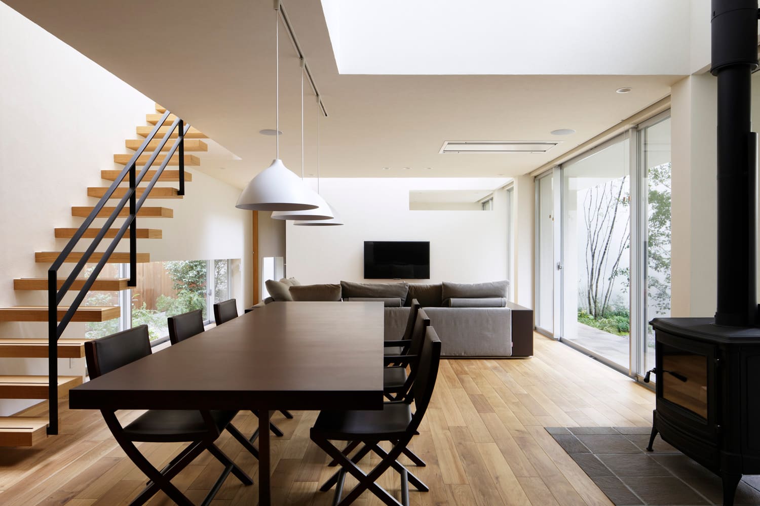 この家の中心は、高い天井から、たっぷりと光が降り注ぐ、開放感あふれるリビングダイニングです。大きな窓の外では、いつでも中庭の緑を眺めることができ、室内にいながら、自然を身近に感じられます。ここは、家族が食卓を囲み、語らい、笑顔が集う、この「村」の、一番賑やかな広場です。