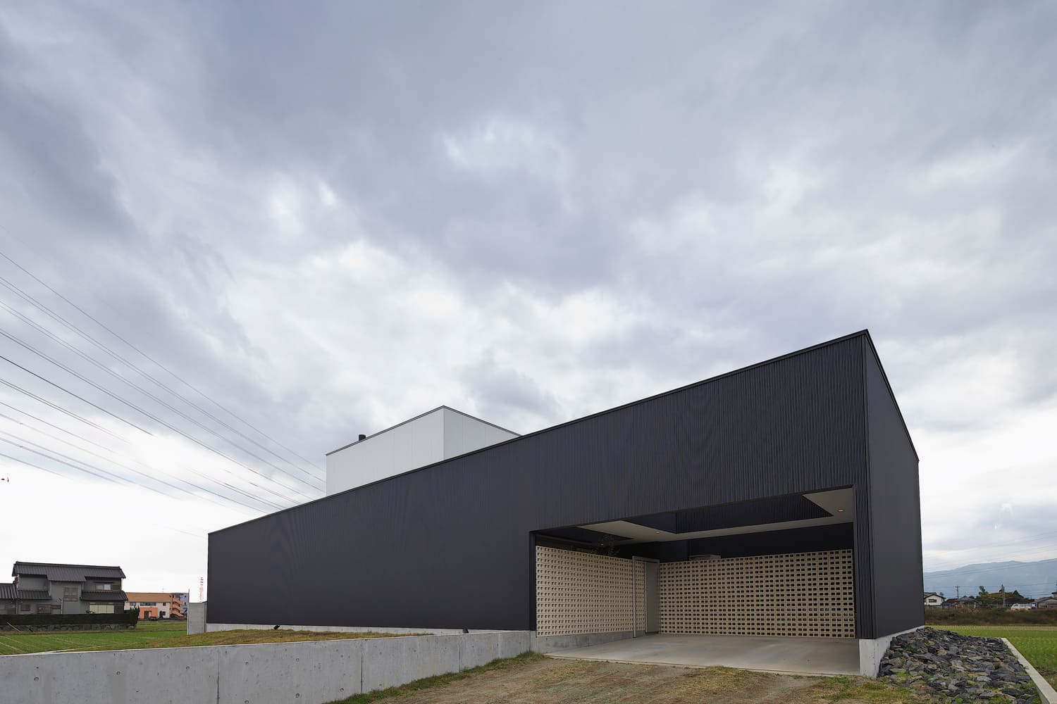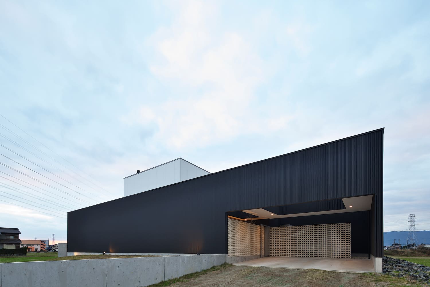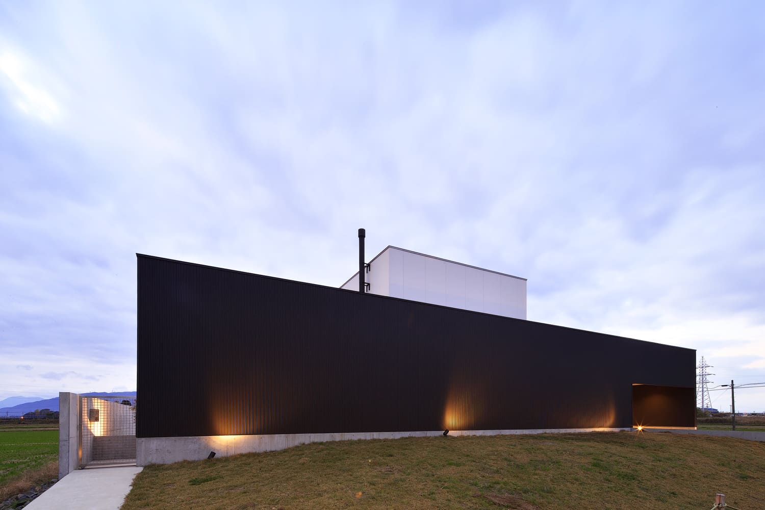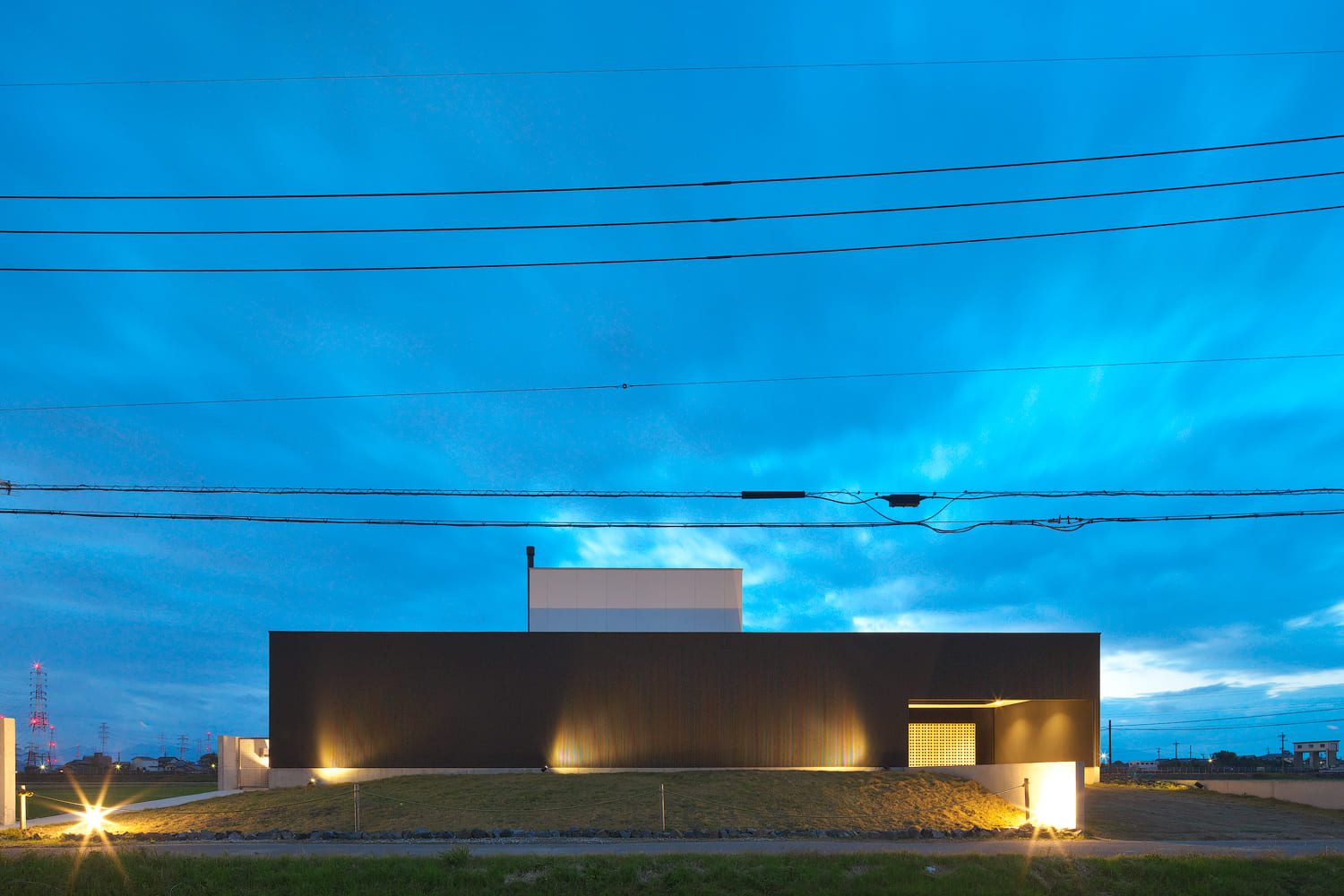 一度見たら忘れられない、圧倒的な存在感を放つ、シャープで、黒い、彫刻のような外観。余計な装飾を一切排し、素材そのものの美しさを追求したデザインは、一日を通して移り変わる光と影によって、様々な表情を見せてくれます。夜には、計算された照明が、その美しいフォルムを闇に浮かび上がらせます。