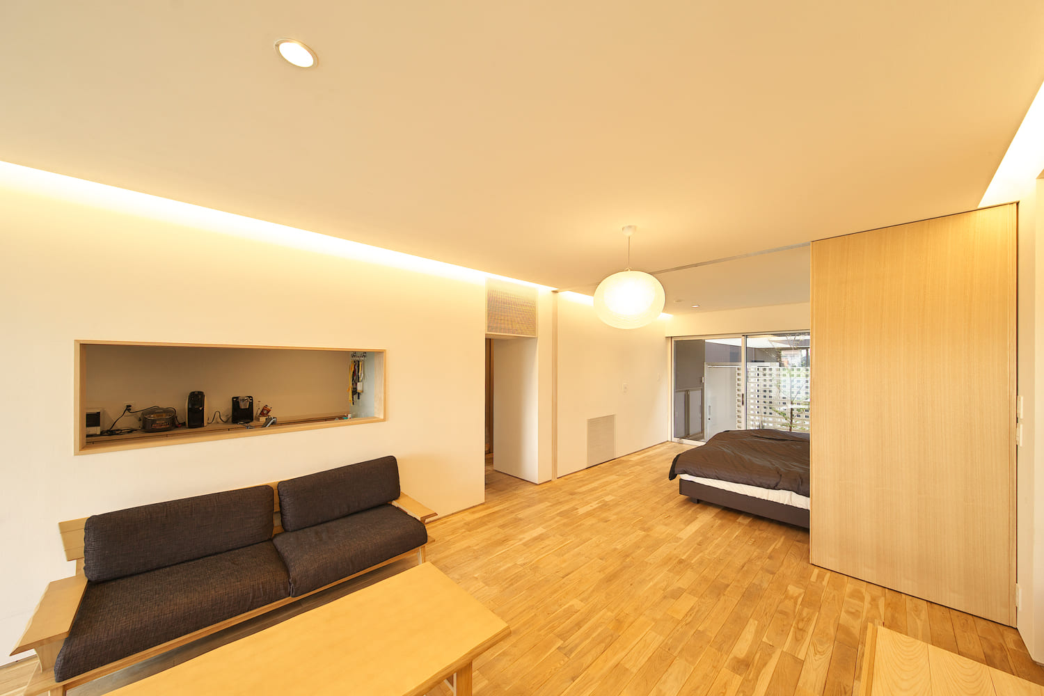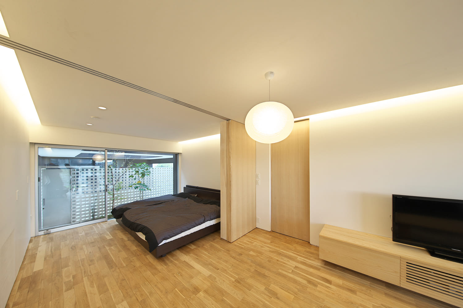 この住まいの心地よさの秘密は、建物の中心を、まるで路地のように貫く、細長い中庭です。この「光の庭」があることで、家の奥まで太陽の光が届き、室内は常に明るく、開放的な雰囲気に。どこにいても、すぐそばに緑を感じられる。この小さな自然が、この家の暮らしを、何倍にも豊かで潤いのあるものにしています。