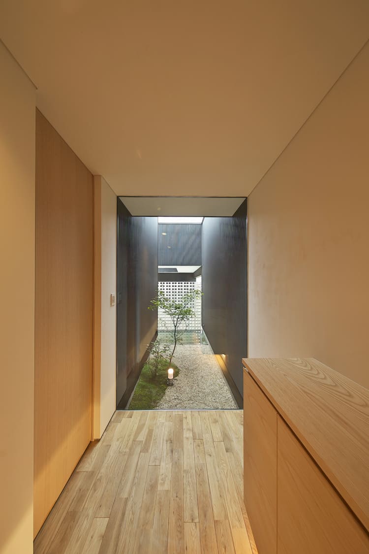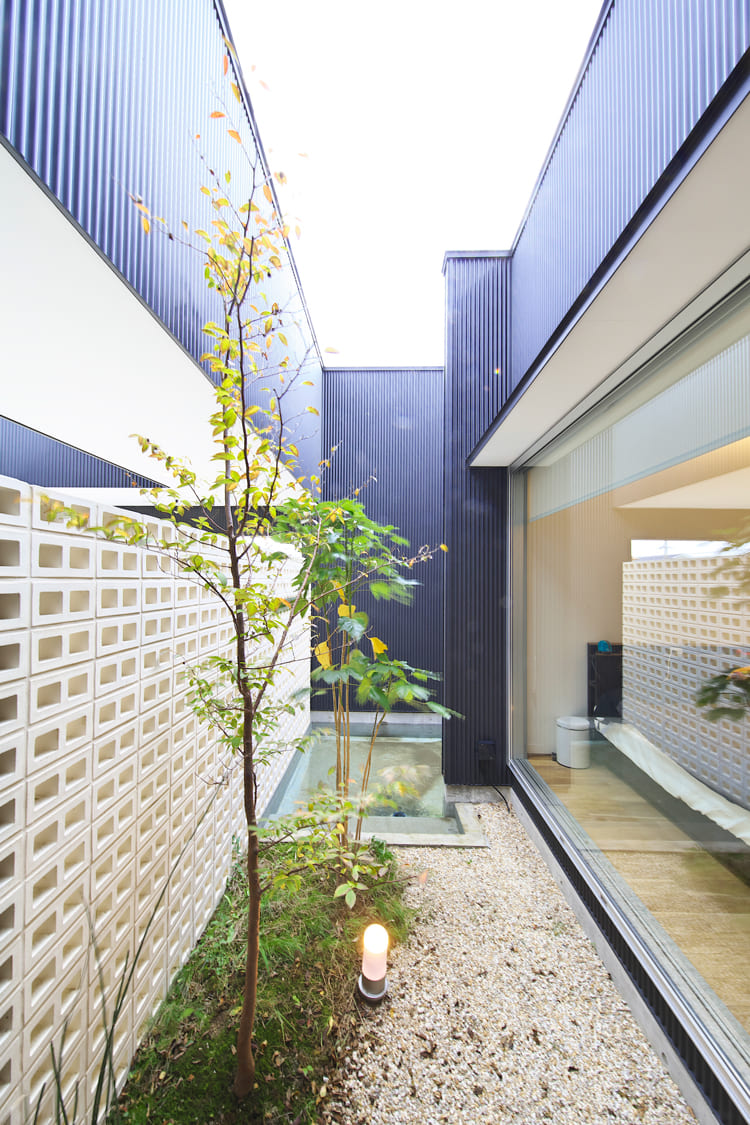 建物の中心を貫くように設けられた、ガラス張りの細長い中庭。この「光の路地」が、家の隅々にまで、空の光と、木々の潤いを届けてくれる。そんな、驚きと感動に満ちた住まいです。