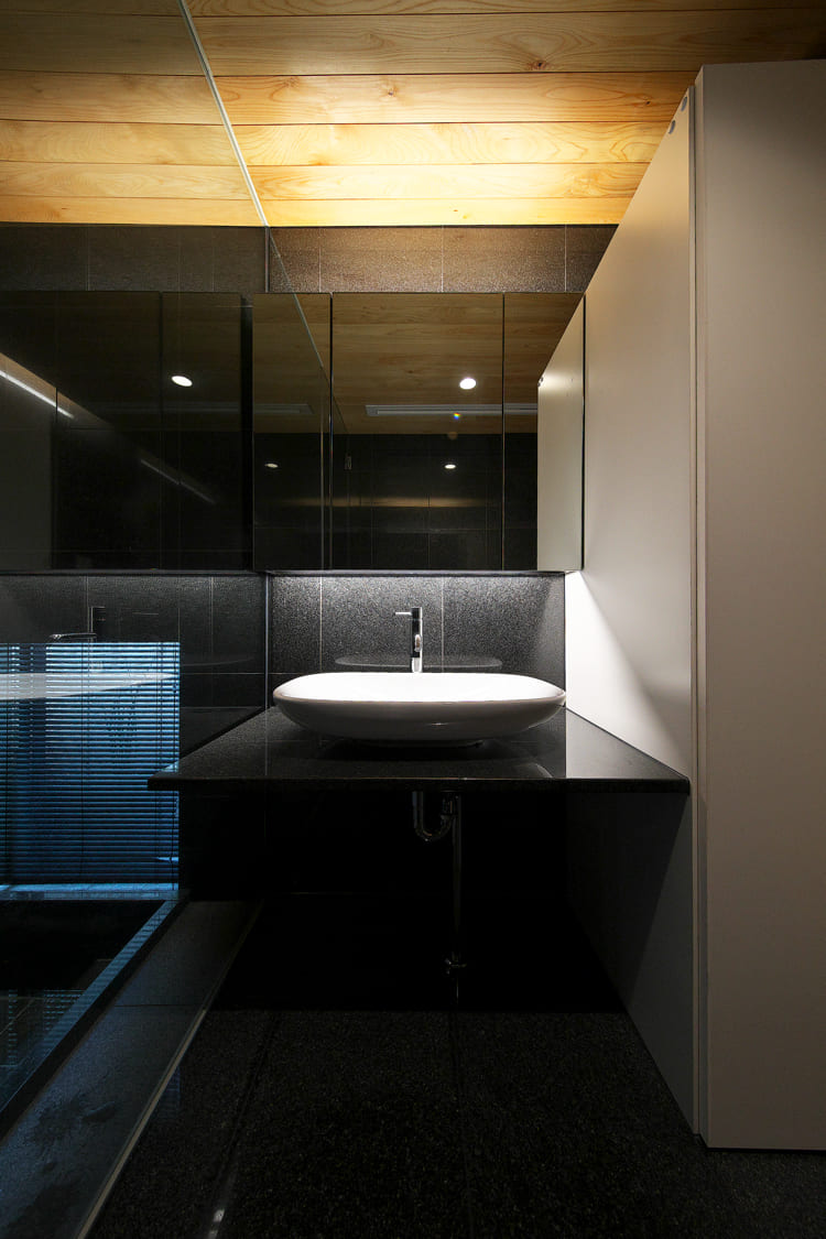 【バスルーム】【洗面台】一日の終わりを、静寂に浸る。洞窟のような、漆黒のバスルーム。