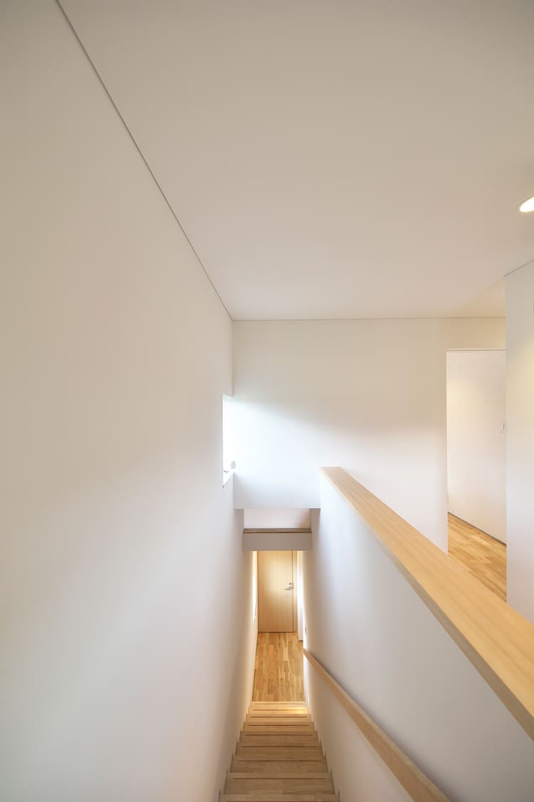 家の上下階を繋ぐのは、温かみのある無垢材で造られた、シンプルで美しい階段です。踏みしめるたびに木の感触が心地よく、壁や天井の質感と調和しながら、家全体に統一感のある温かい雰囲気をもたらしています。