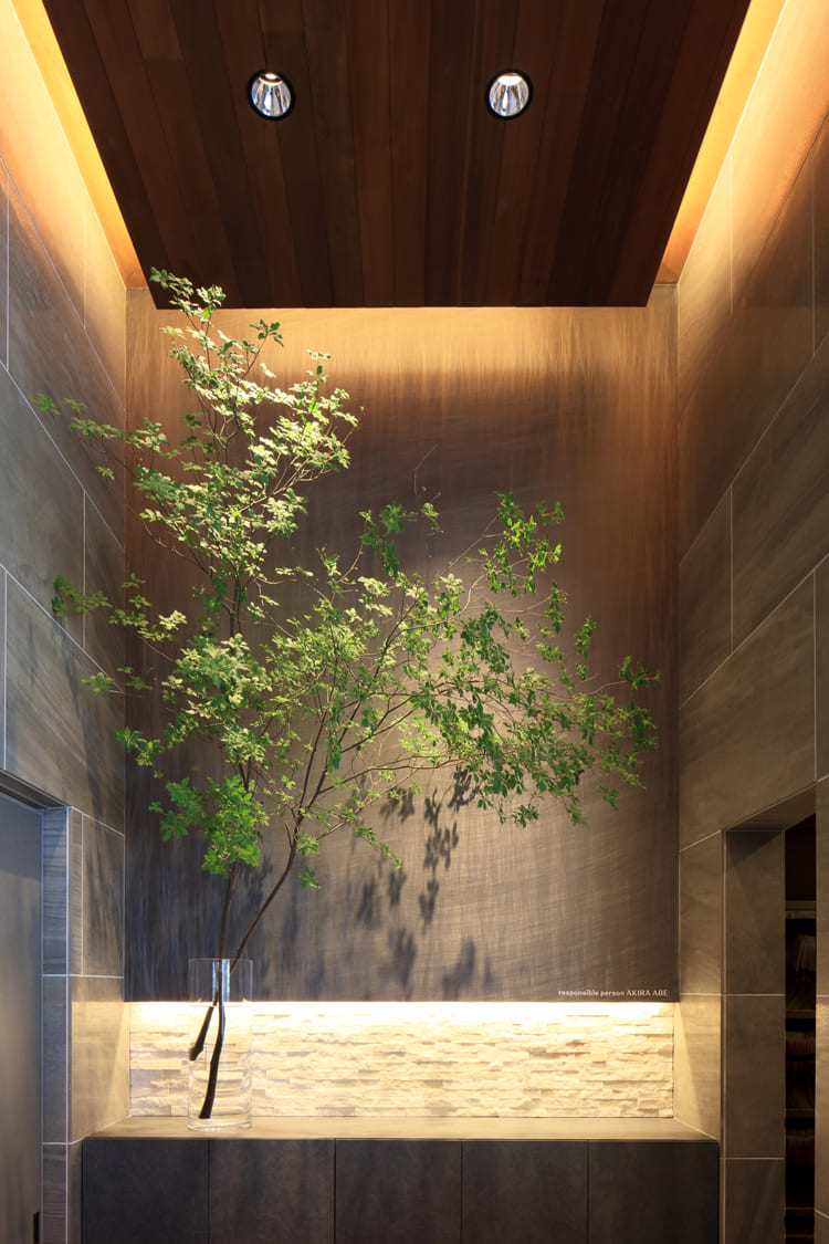 ダークな色調の壁に、シンプルな洗面カウンターを設え、一輪挿しの草木が、空間に彩りを添える。
