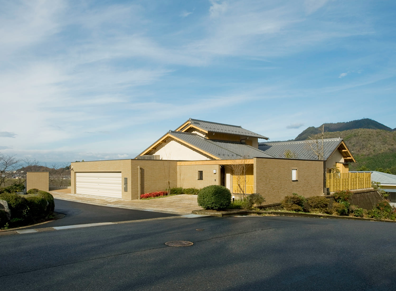 丘の傾斜に寄り添うように建てられた、モダンでありながら木の温もりを感じる佇まい。