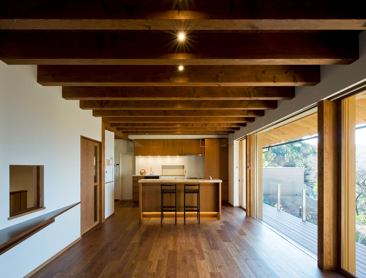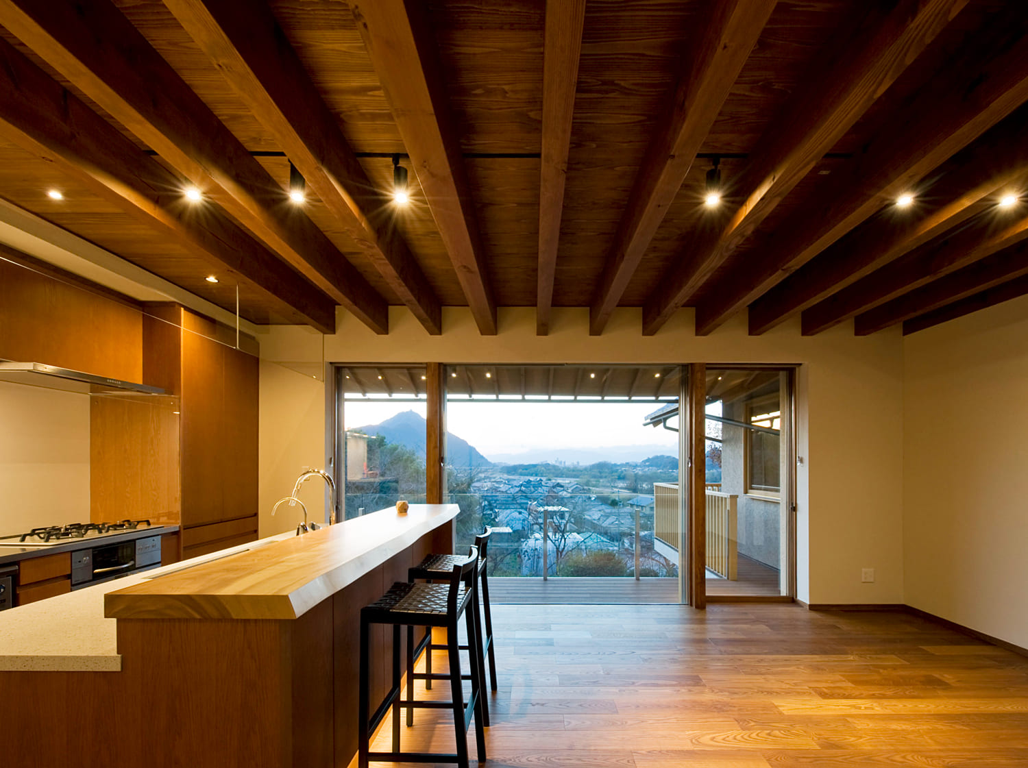 景色を最大限に愉しむために設けられた大きな窓と、空へと開かれた広々としたバルコニーが、この家の開放的な暮らしを物語っています。