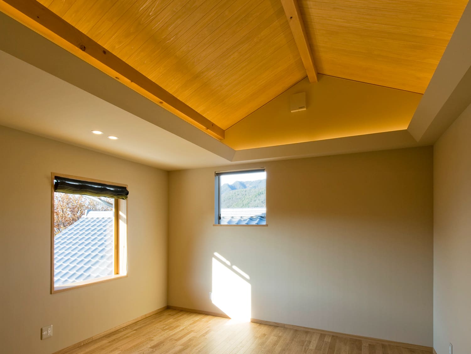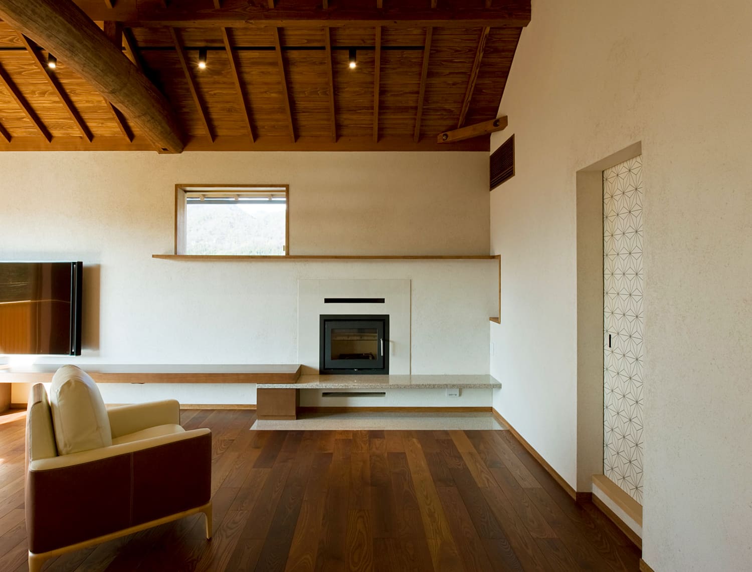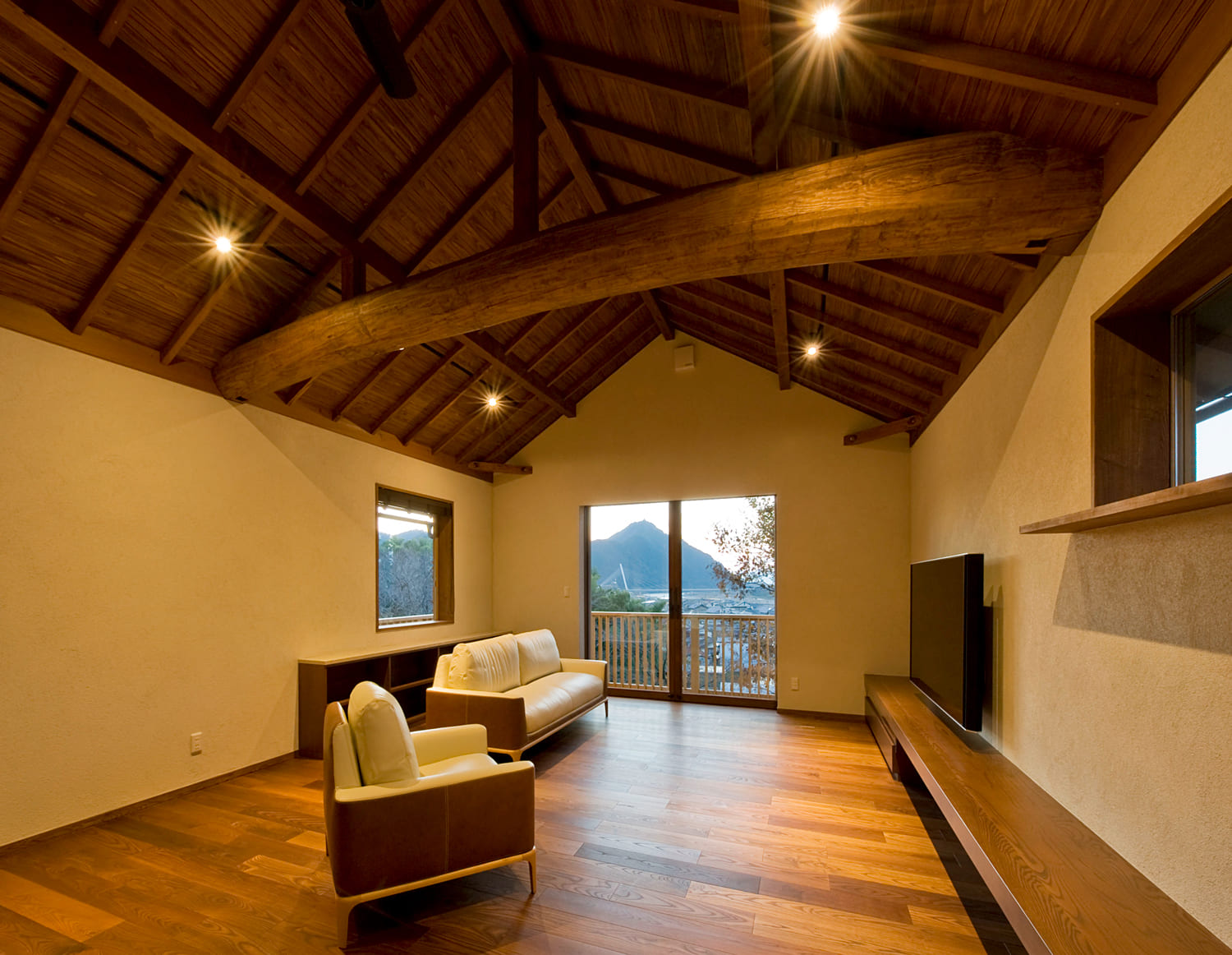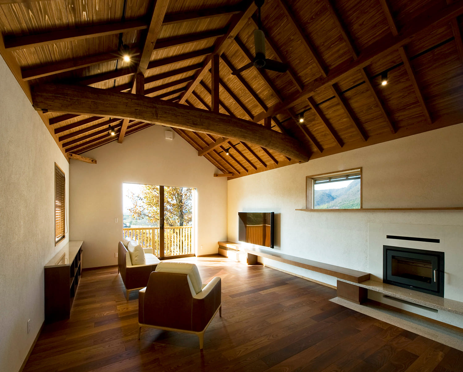 この邸宅のリビングは、太く力強い梁(はり)を幾重にも見せた、山荘(ロッジ)のように落ち着いた空間。