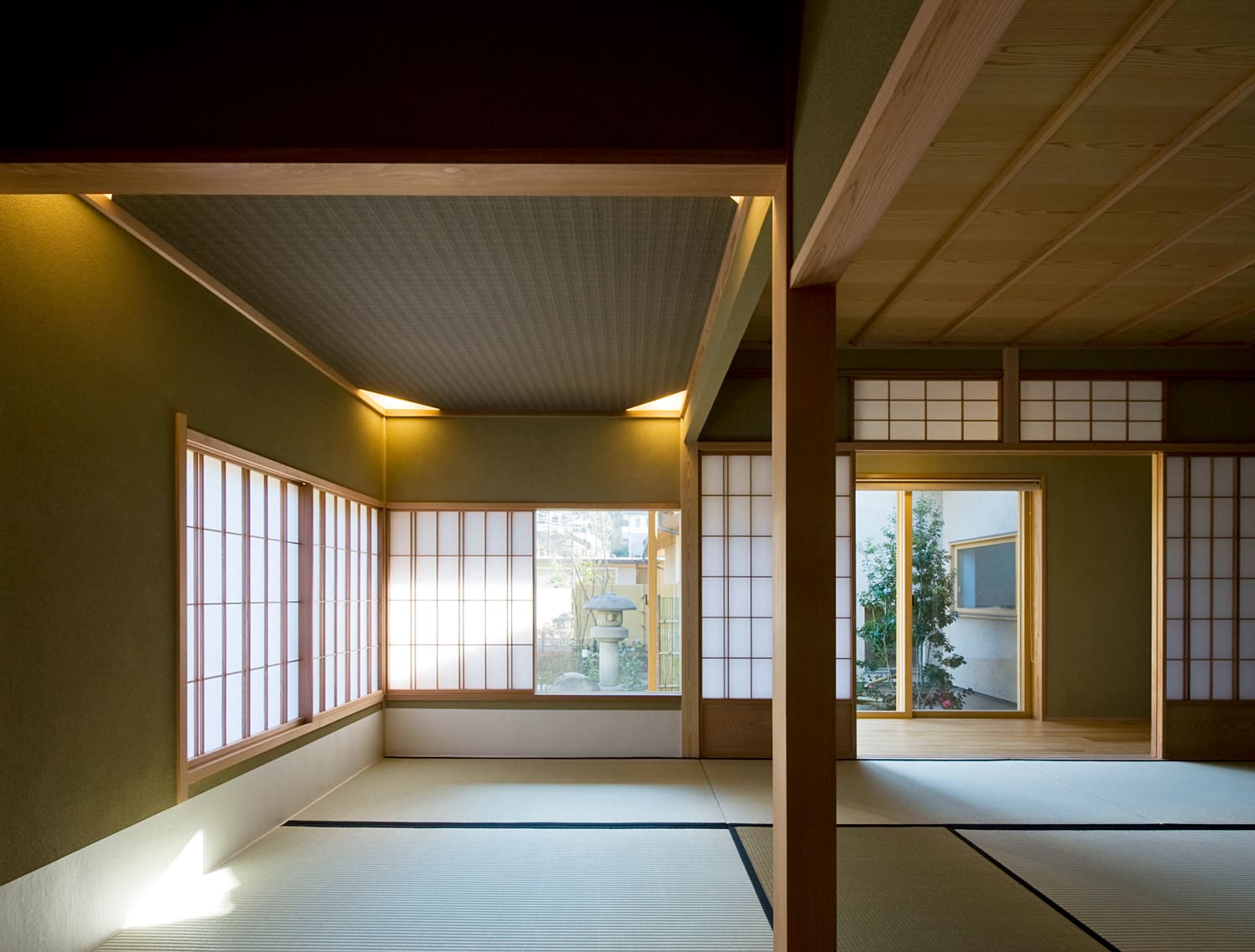 い草の香りが清々しい畳、障子を通して和らいだ光、そして聚楽(じゅらく)壁の落ち着いた色合いが、凛とした静寂を創り出します。