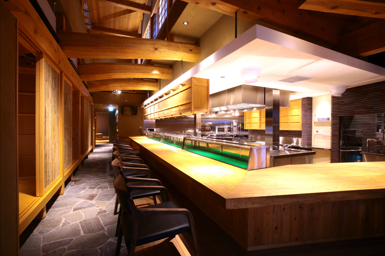 カウンターや個室へと続く廊下は、あえて照明を落とし、静寂に満ちた空間として設計されています。足元の石畳を、ほのかな光が照らし出し、奥に見えるダイニングの明るさを際立たせる。この光と影のコントラストが、単なる通路を、特別な空間への期待感を高めるための一部として演出しています。