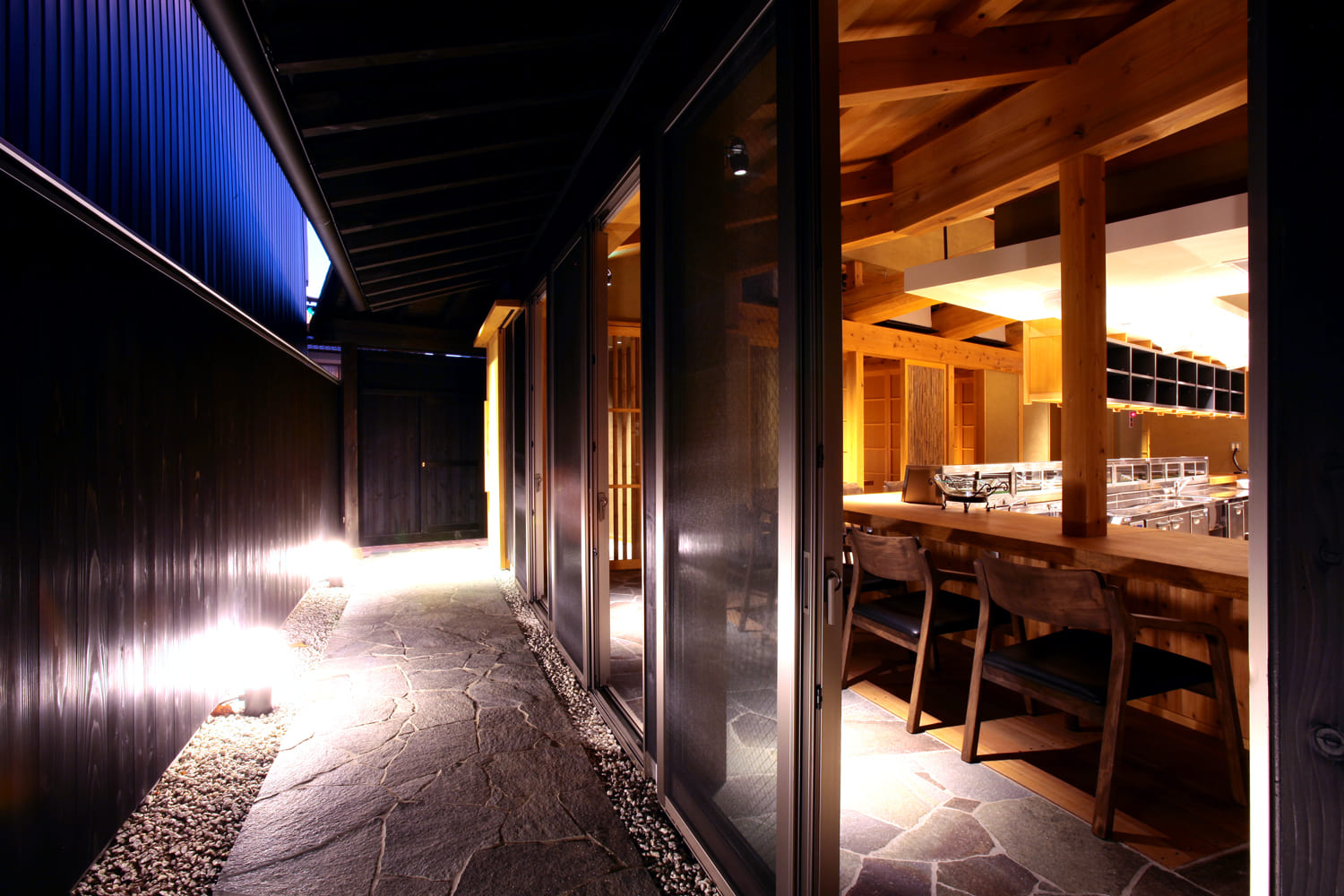黒を基調とした、シャープでモダンな壁。その上に、いぶし銀に輝く、趣のある瓦屋根を載せました。異素材を組み合わせながらも、全体として調和のとれた、凛とした佇まいです。夕暮れ時、静かな路地に、入り口からこぼれる温かな光が、まるで「こちらへどうぞ」と優しく手招きしているかのよう。これから始まる特別な時間への、期待感を高めてくれます。