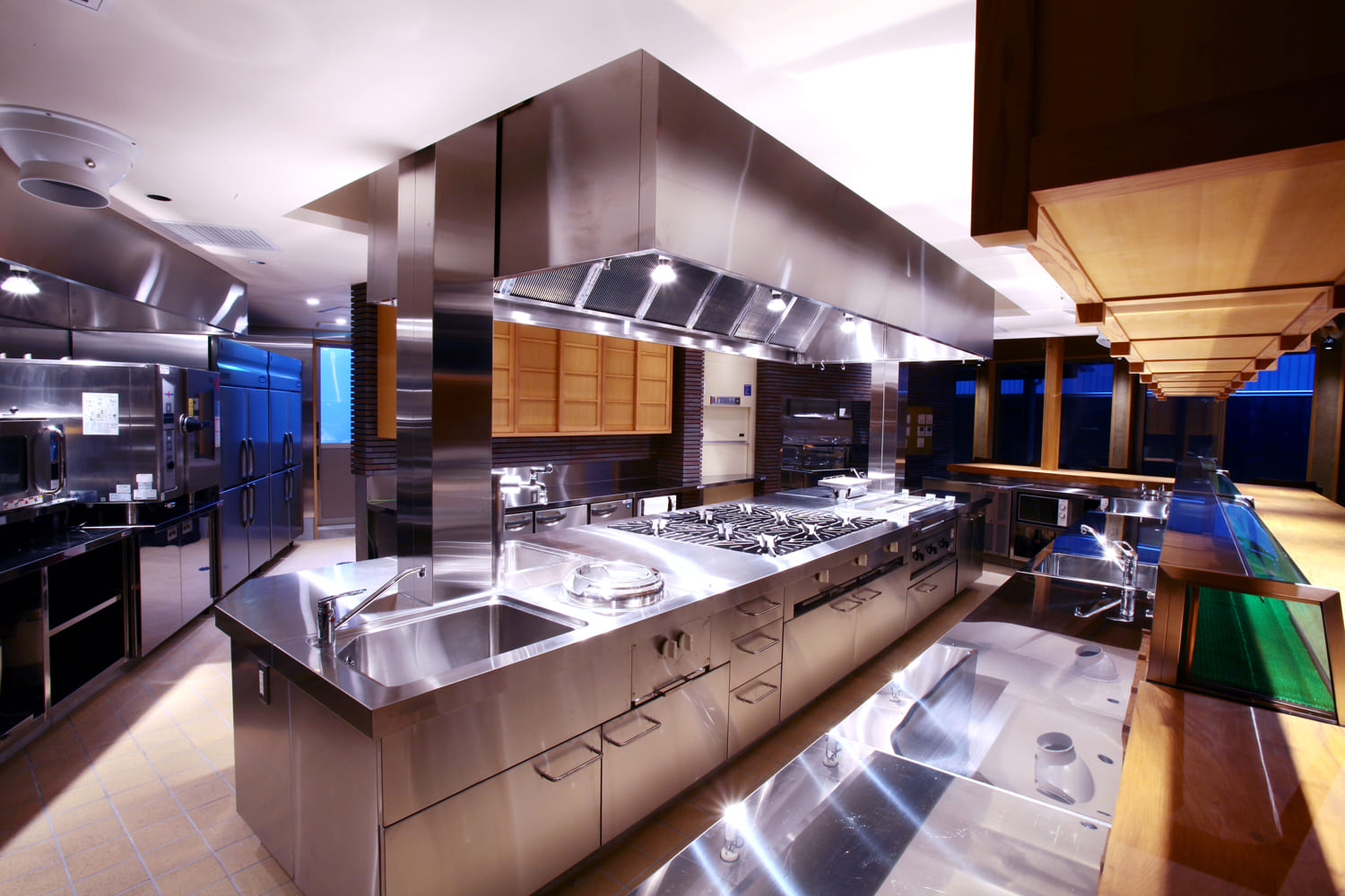 お客様をもてなす料理が生まれる厨房は、一切の無駄を削ぎ落とした、機能美の空間です。輝くステンレスで統一された、プロ仕様の調理台や設備。最高の料理を、最高の状態で提供するための、まさに「食の司令塔」です。見えない場所にこそ手を抜かない。その誠実な姿勢が、建物全体の信頼感を支えています。