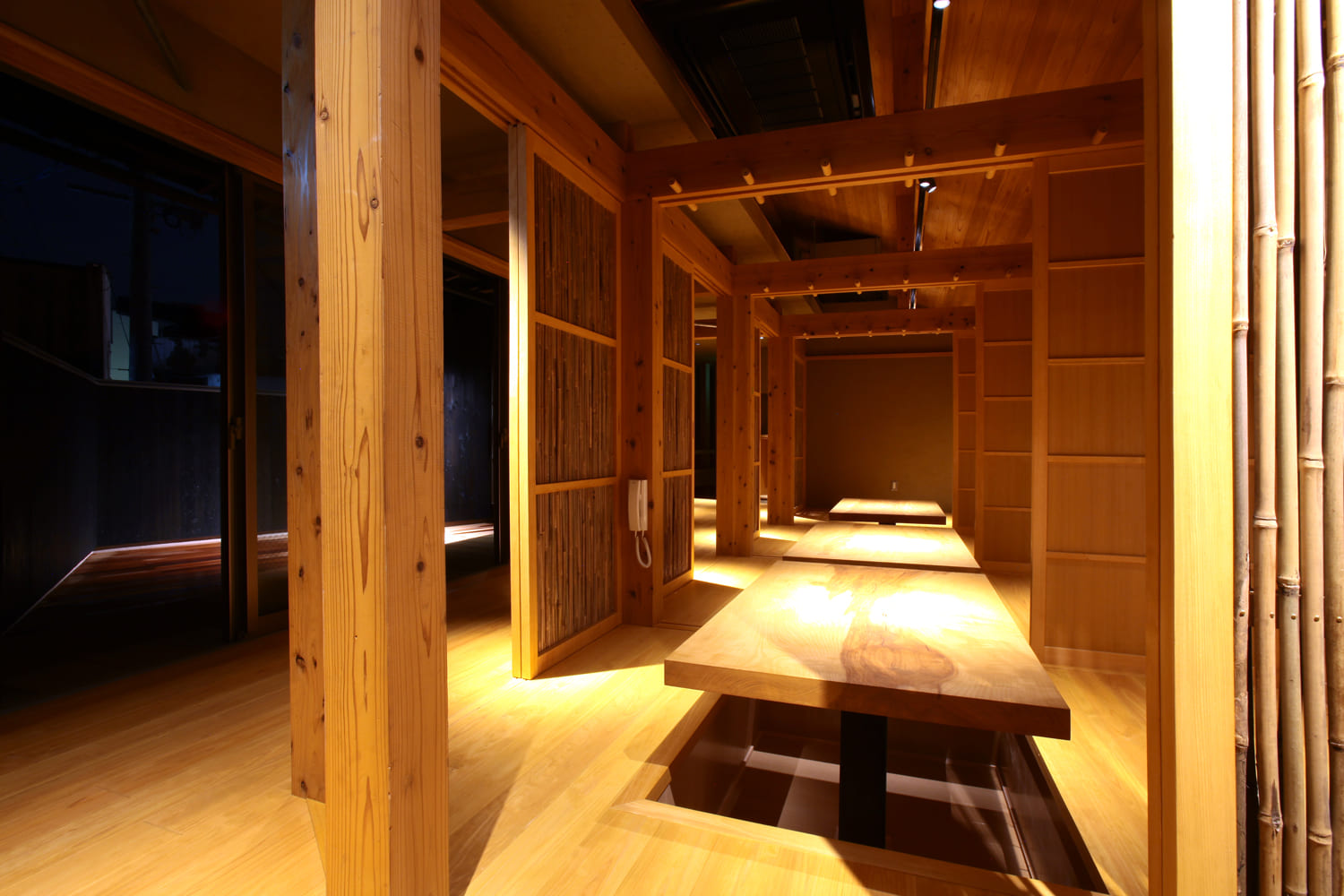 二階に上がると、そこには、壁も、柱も、建具も、すべてが美しい木で設えられた、温もりあふれる個室空間が広がります。掘りごたつ式のテーブルを囲めば、自然と会話も弾み、心からリラックスした時間を過ごせます。木の香りと、柔らかな照明に包まれた、親しい人との語らいにふさわしい、プライベートな空間です。