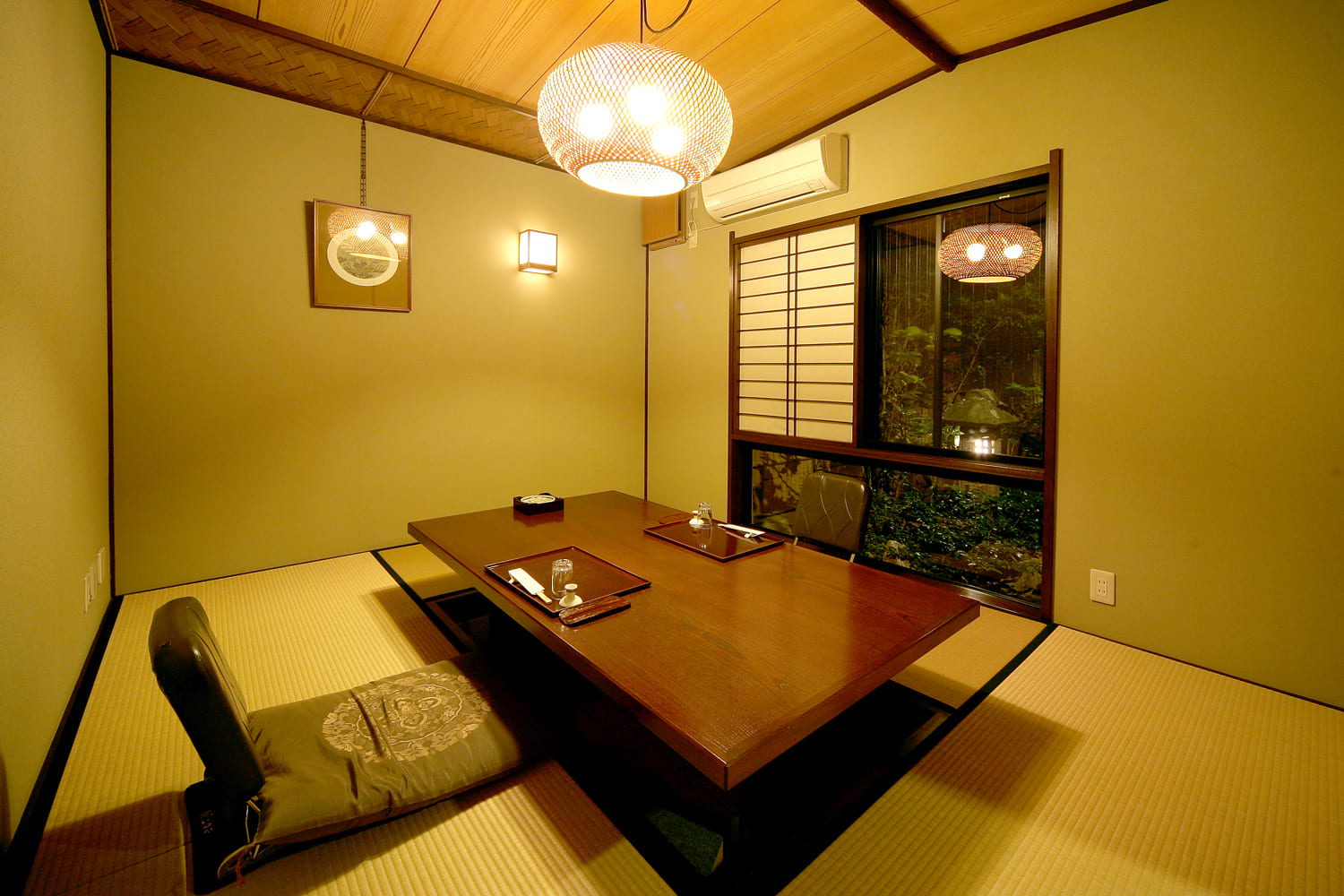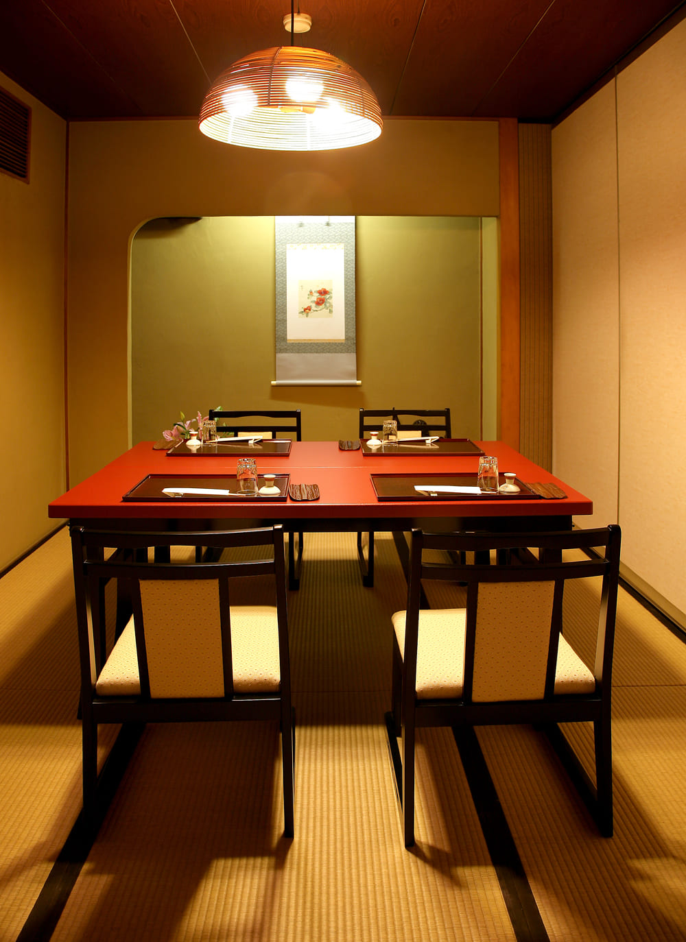 大切な人と、周りを気にせず、ゆっくりと語らいたい。そんな時にふさわしい、こぢんまりとした個室です。掘りごたつ式のテーブルなので、畳の上でも楽に過ごすことができ、障子や丸い照明からこぼれる柔らかな光が、親密な雰囲気を演出します。まるで隠れ家のような、心から寛げるこの空間は、日々の暮らしの中に「特別な時間」をもたらしてくれます。
